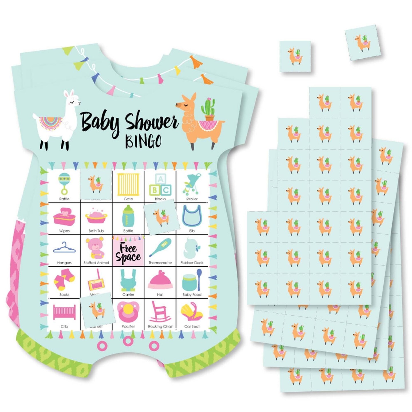 Big Dot of Happiness Whole Llama Fun - Picture Bingo Cards and Markers - Llama Fiesta Baby Shower Shaped Bingo Game - Set of 18