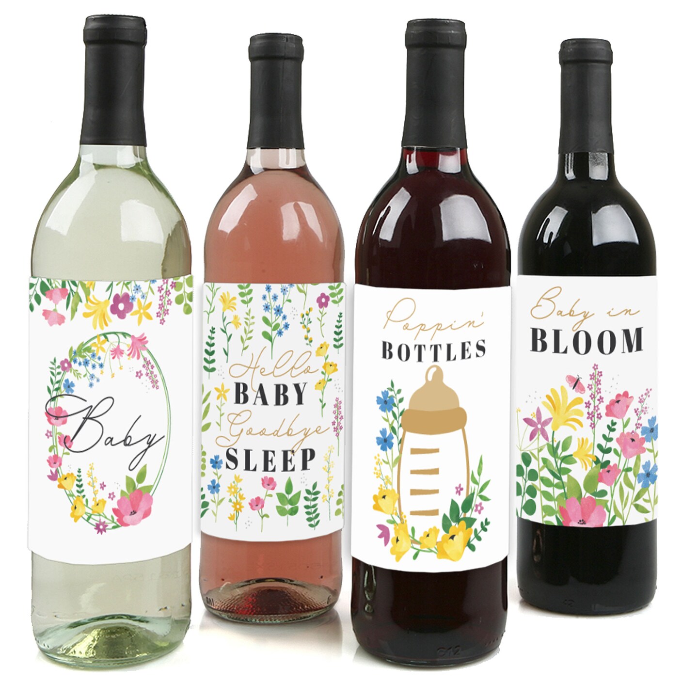 Big Dot of Happiness Wildflowers Baby - Boho Floral Baby Shower Decorations for Women and Men - Wine Bottle Label Stickers - Set of 4