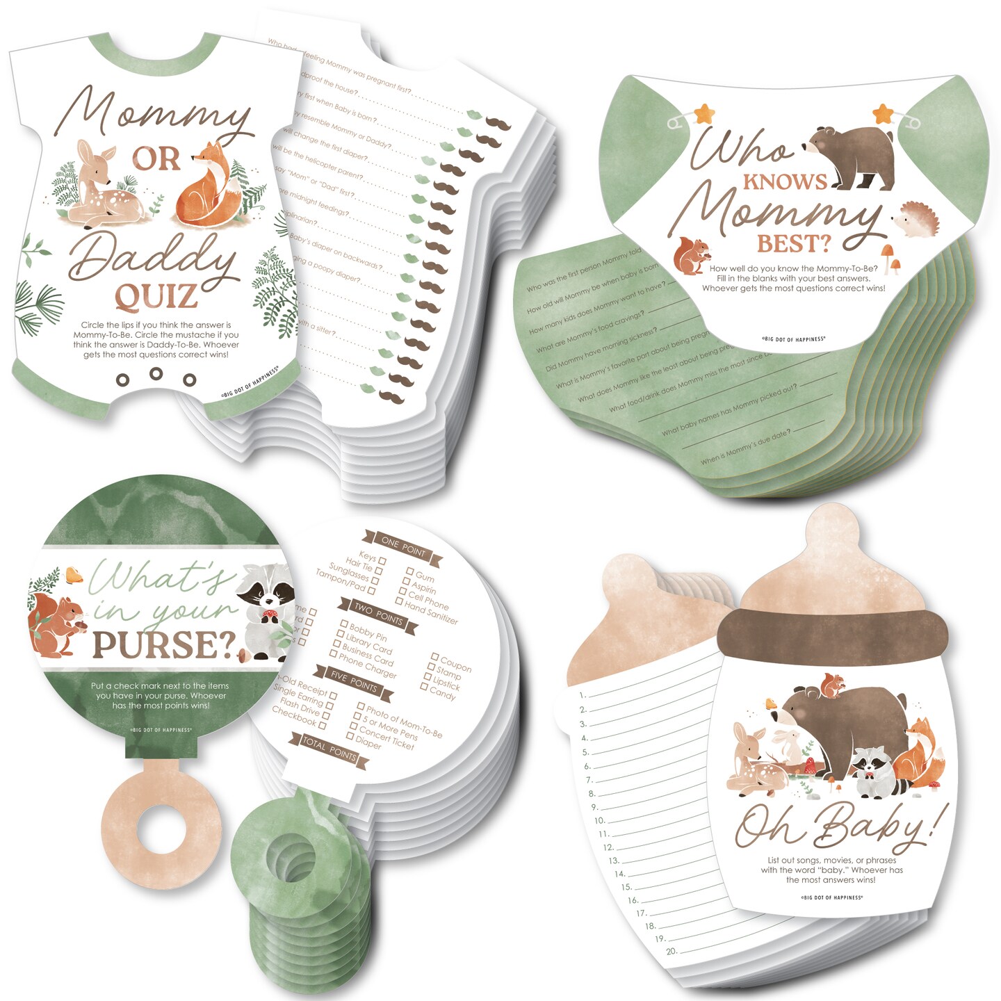 Big Dot of Happiness Woodland Animals Baby Shower Game Bundle Pack, 4 Different Party Activities (10 Cards Each)