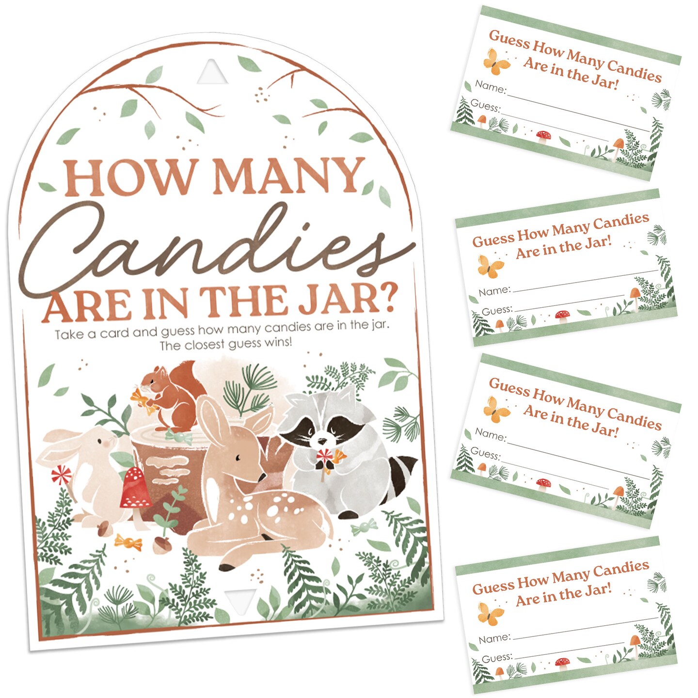 Big Dot of Happiness Woodland Animals Candy Guessing Game, Forest Baby Shower or Birthday Activity, How Many Candies in the Jar, 1 Stand & 40 Cards