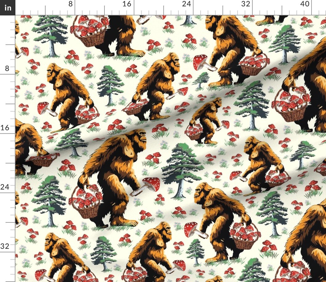 Bigfoot Mushroom Foraging Whimsical Funny Quirky Sasquatch Green Brown Red Custom Printed Fabric by Spoonflower Various Fabrics by the Yard or Fat Quarter