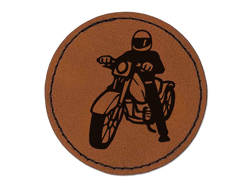 Biker on Motorcycle Round Iron-On Engraved Faux Leather Patch Applique - 2.5"