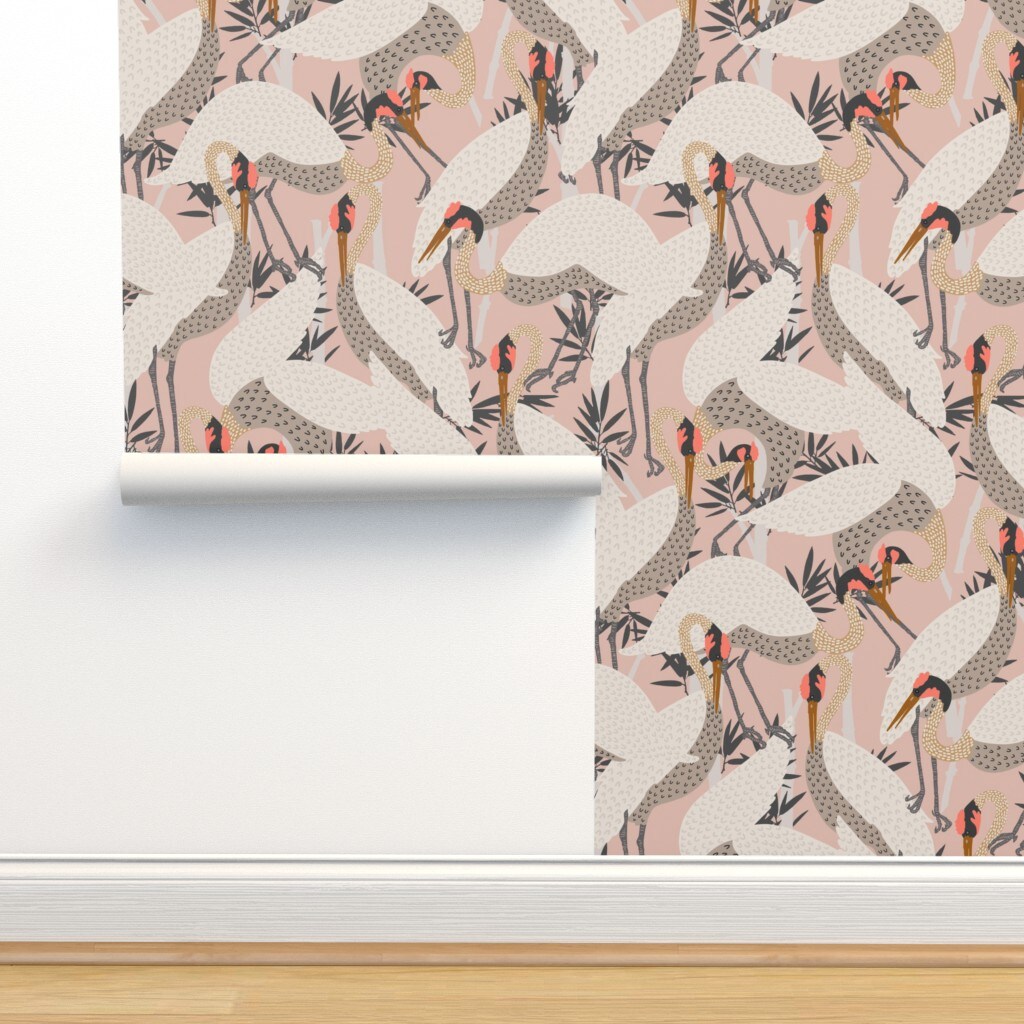 Bird Pink White Baby Nursery Fly Flight Heron Swamp Custom Removable Wallpaper by Spoonflower Peel & Stick Wallpaper 2FT Wide