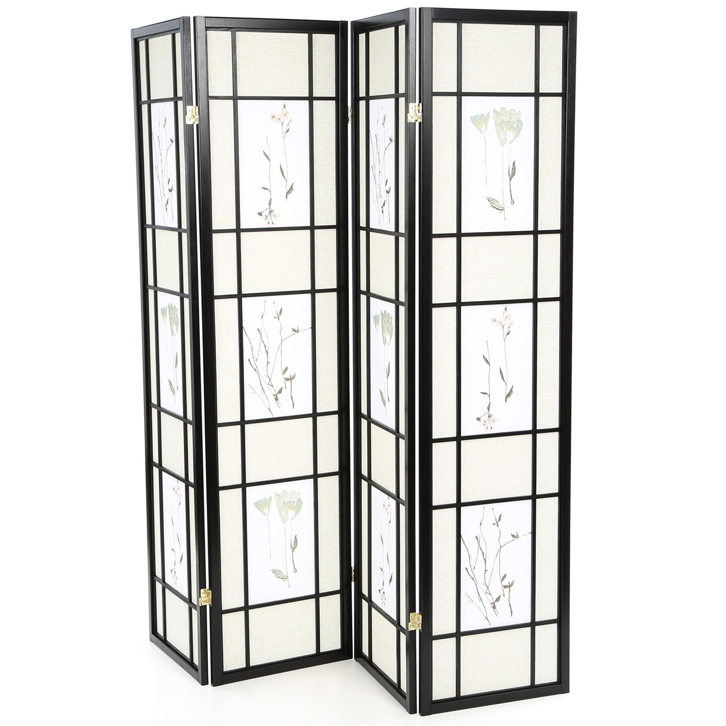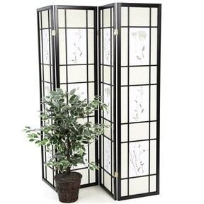 Black 4-Panel Shoji Room Divider Screen with Floral Panels