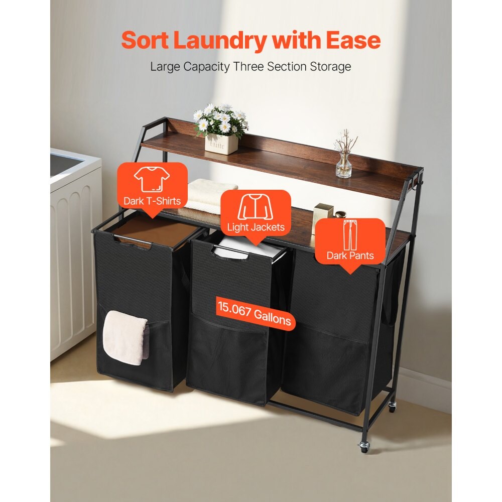 Black 600D Oxford Fabric Section Laundry Sorter with Wheels, Hooks and Tabletop