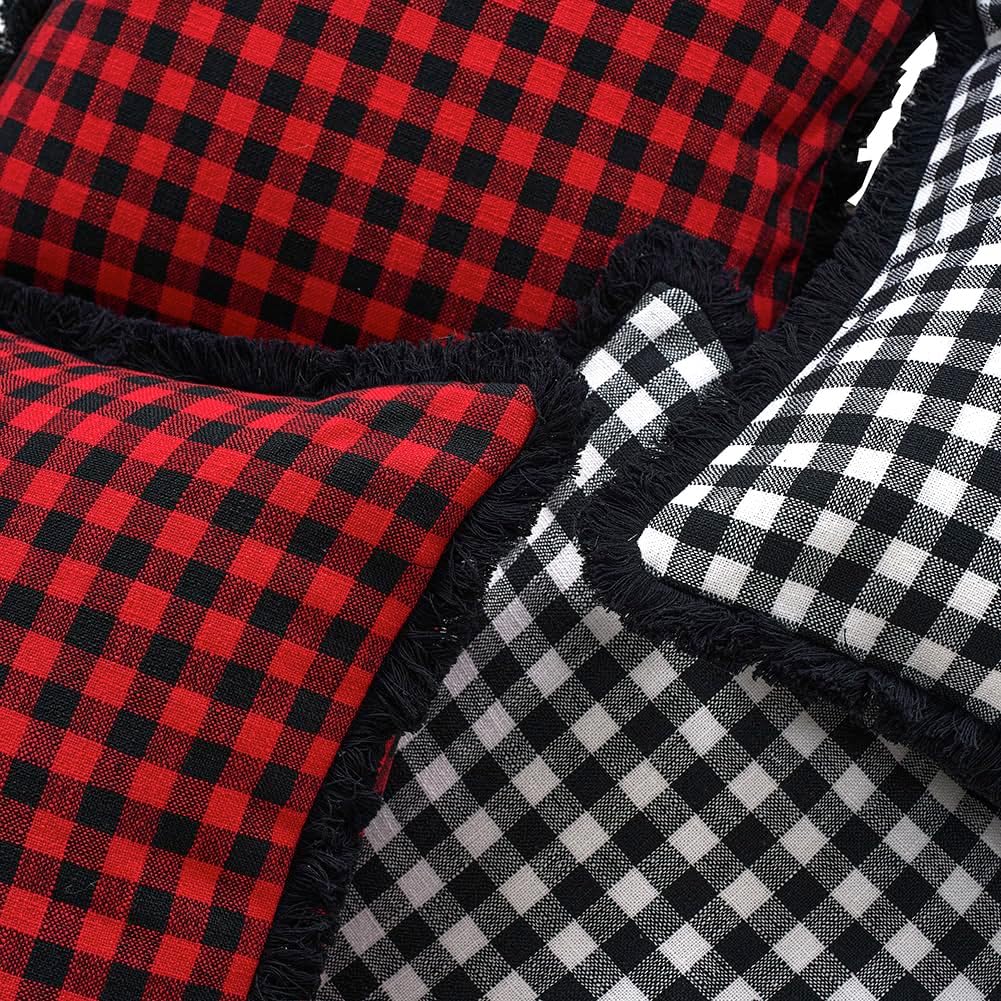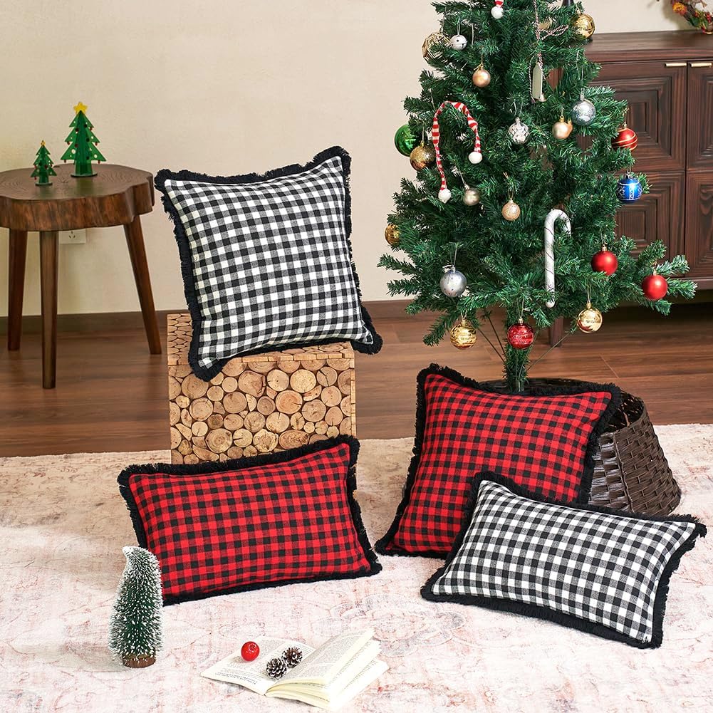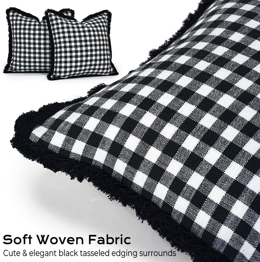 Black and White Christmas Decor Plaid Pillow Covers 18x18 Set of 2 with Tassels, Black Buffalo Plaid Christmas Pillows, Black Christmas Checkered Outdoor Winter Holiday Pillow Covers
