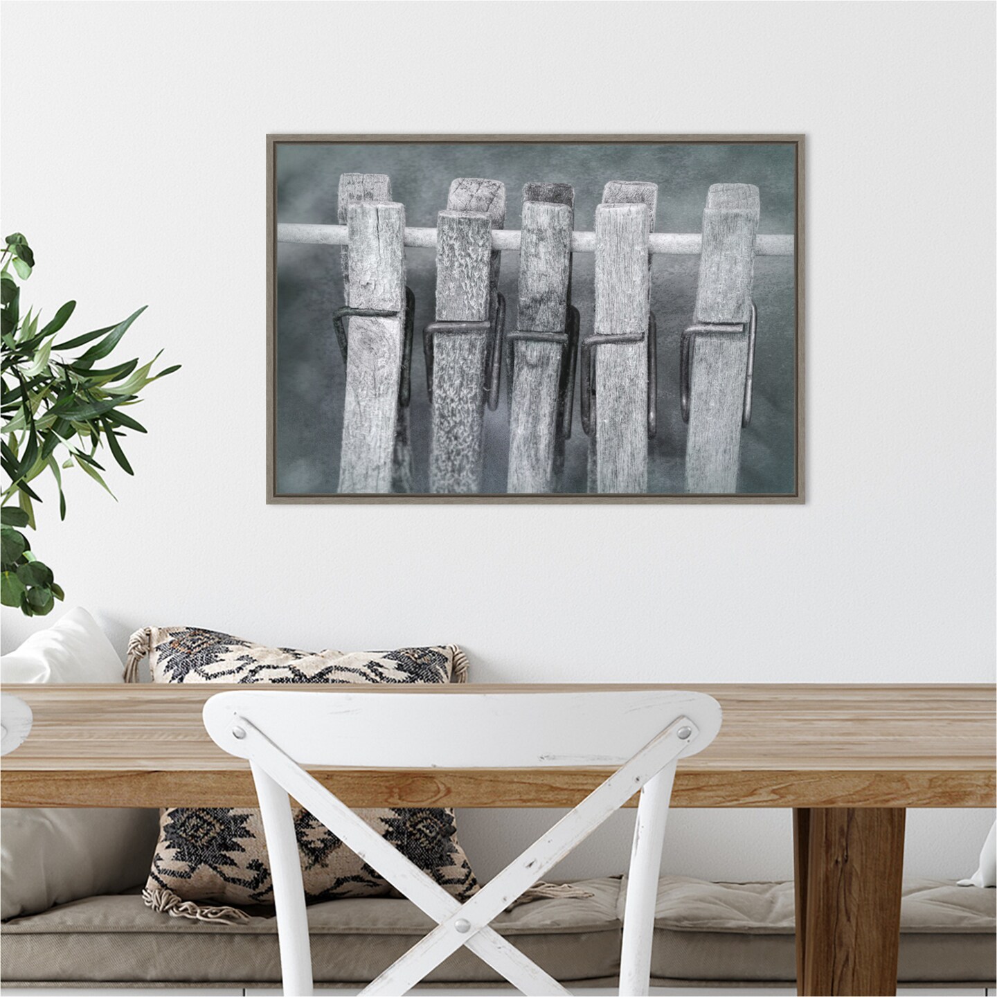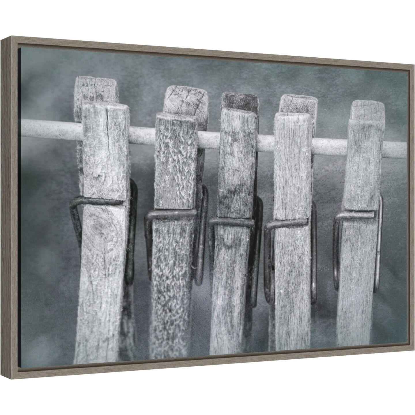 Black and white of clothespins hanging from clothes line by Jaynes Gallery Danita Delimont 23-in. W x 16-in. H. Canvas Wall Art Print Framed in Grey