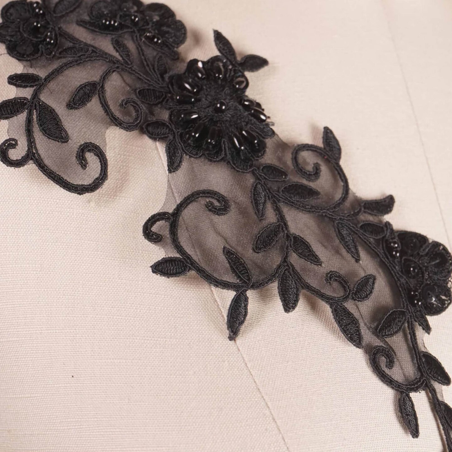 Black Beaded Sequin Lace Applique Pair Floral Embroidered Evening 9 x 4 Inch