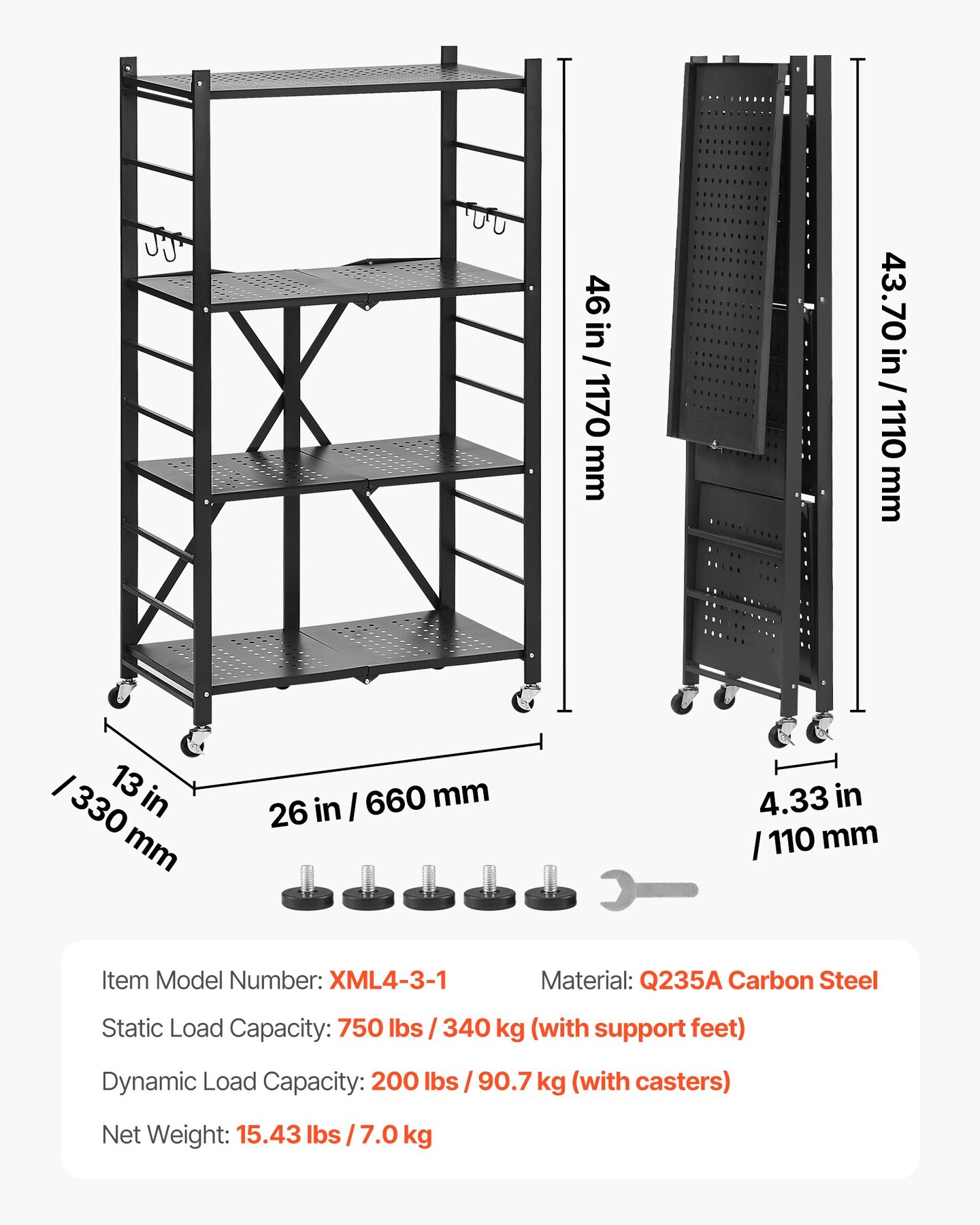 Black Carbon Steel 4 Tier Foldable Garage Storage Shelf with Wheels