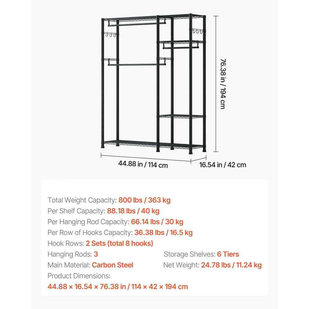 Black Carbon Steel 6-Tier Wardrobe Rack with Hanging Rods and Hooks