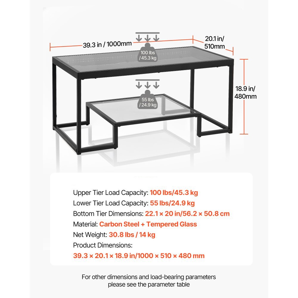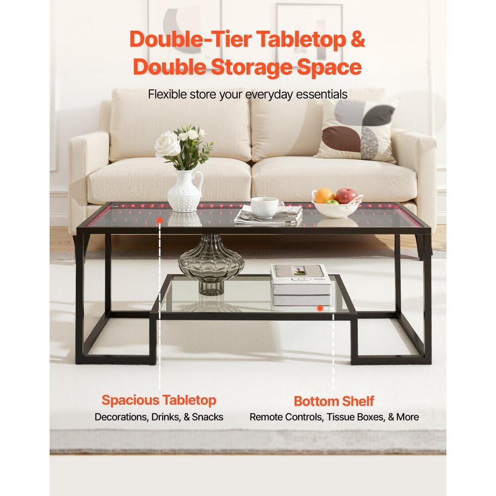 Black Carbon Steel Tempered Glass Coffee Table 2-Tier LED Lights
