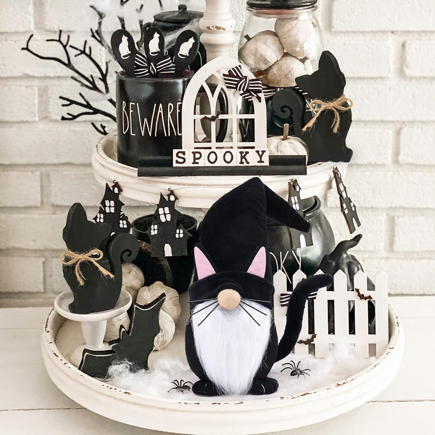Black Cat Gnome Plush – 13.5" Handmade Scandinavian Tomte Figurine – Halloween & Christmas Farmhouse Decor – Perfect Gift for Women and Cat Lovers