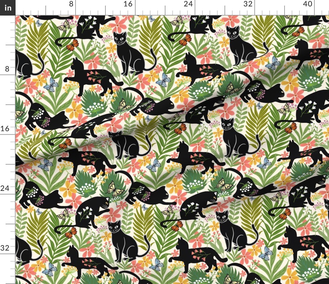 Black Cat Playful Leaves Botanical Butterflies Green Pink Yellow Blue Custom Printed Fabric by Spoonflower Various Fabrics by the Yard or Fat Quarter