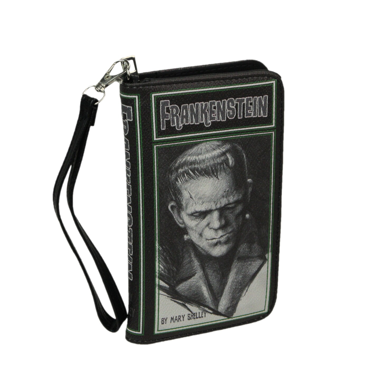 Black Frankenstein Book Wallet Wristlet – Gothic ID Holder, Snap Close, Zipper Coin Pouch, 4 Card Slots, and Bill Pockets – Perfect Gift for Fans of Classic Horror