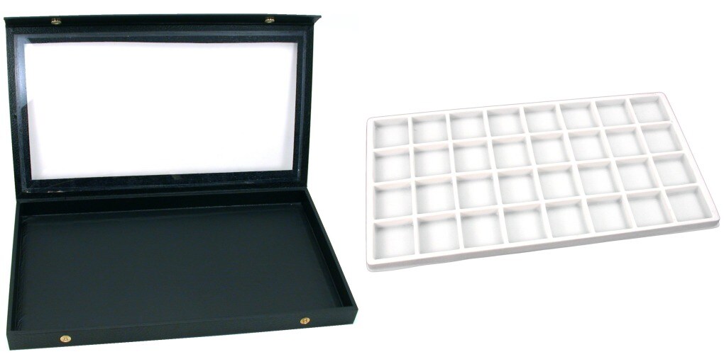 Black Glass Top Jewelry Case (Snap close lid) w/ White 32-slot Plastic Tray