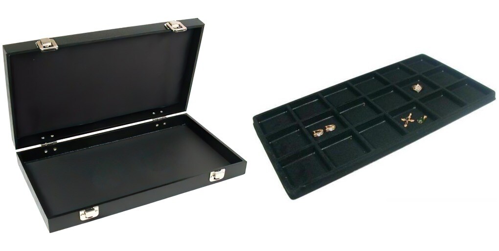 Black Jewelry Case (2xMetal Clasps &Removable Lid) w/ Black 18-slot Plastic Tray