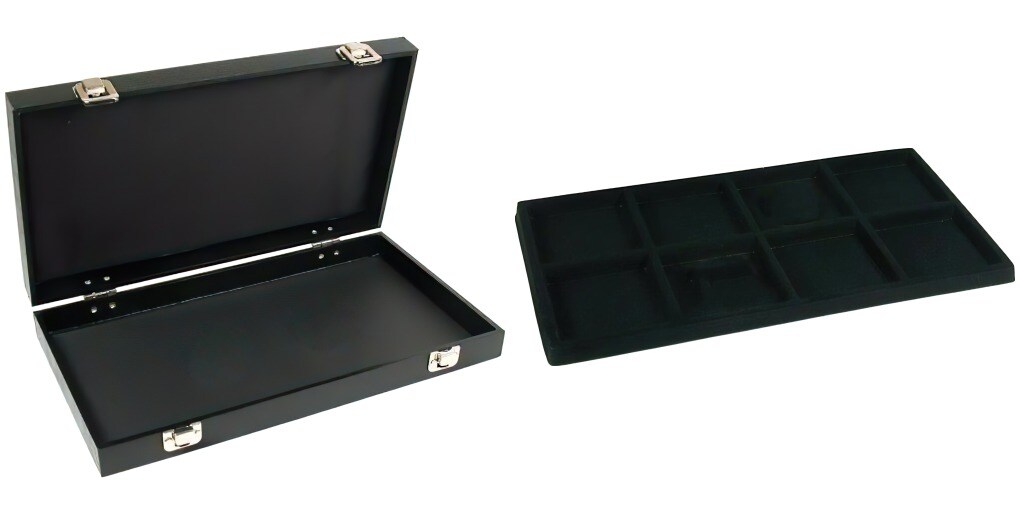 Black Jewelry Case (2xMetal Clasps & Removable Lid) w/ Black 8-slot Plastic Tray