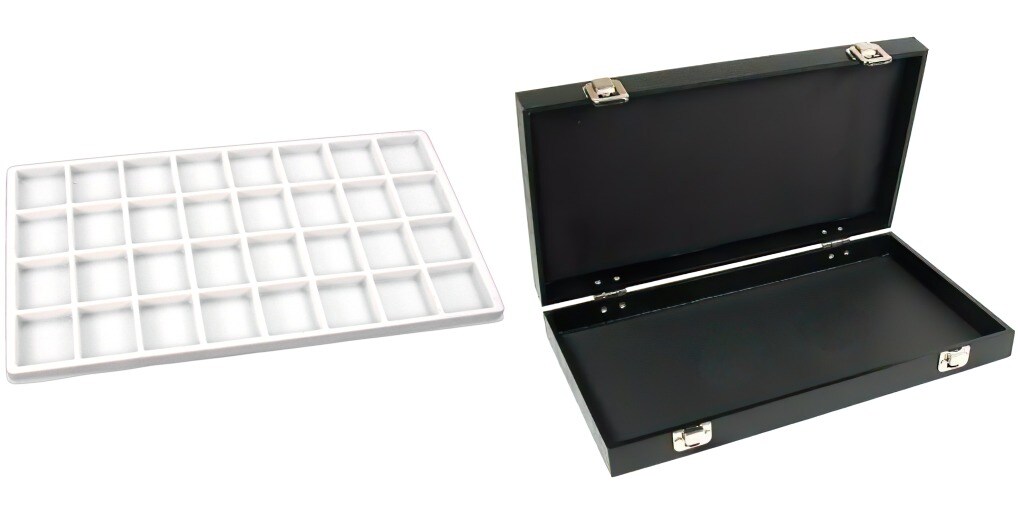 Black Jewelry Case (2xMetal Clasps &Removable Lid) w/ White 32-slot Plastic Tray