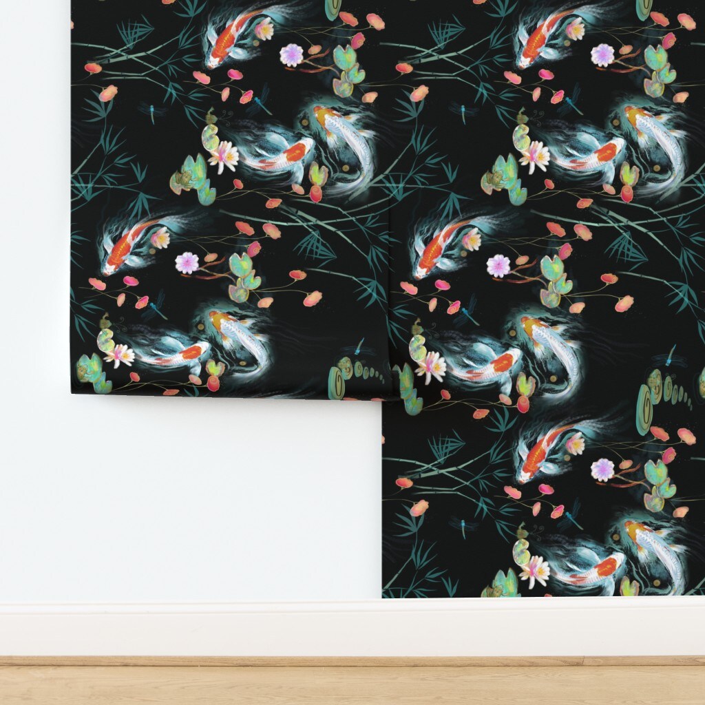 Black Koi Fish Japanese Floral Large Scale Decorative Carp Chinoiserie Water Garden Custom Pre-pasted Wallpaper by Spoonflower Pre-Pasted Wallpaper 2FT Wide