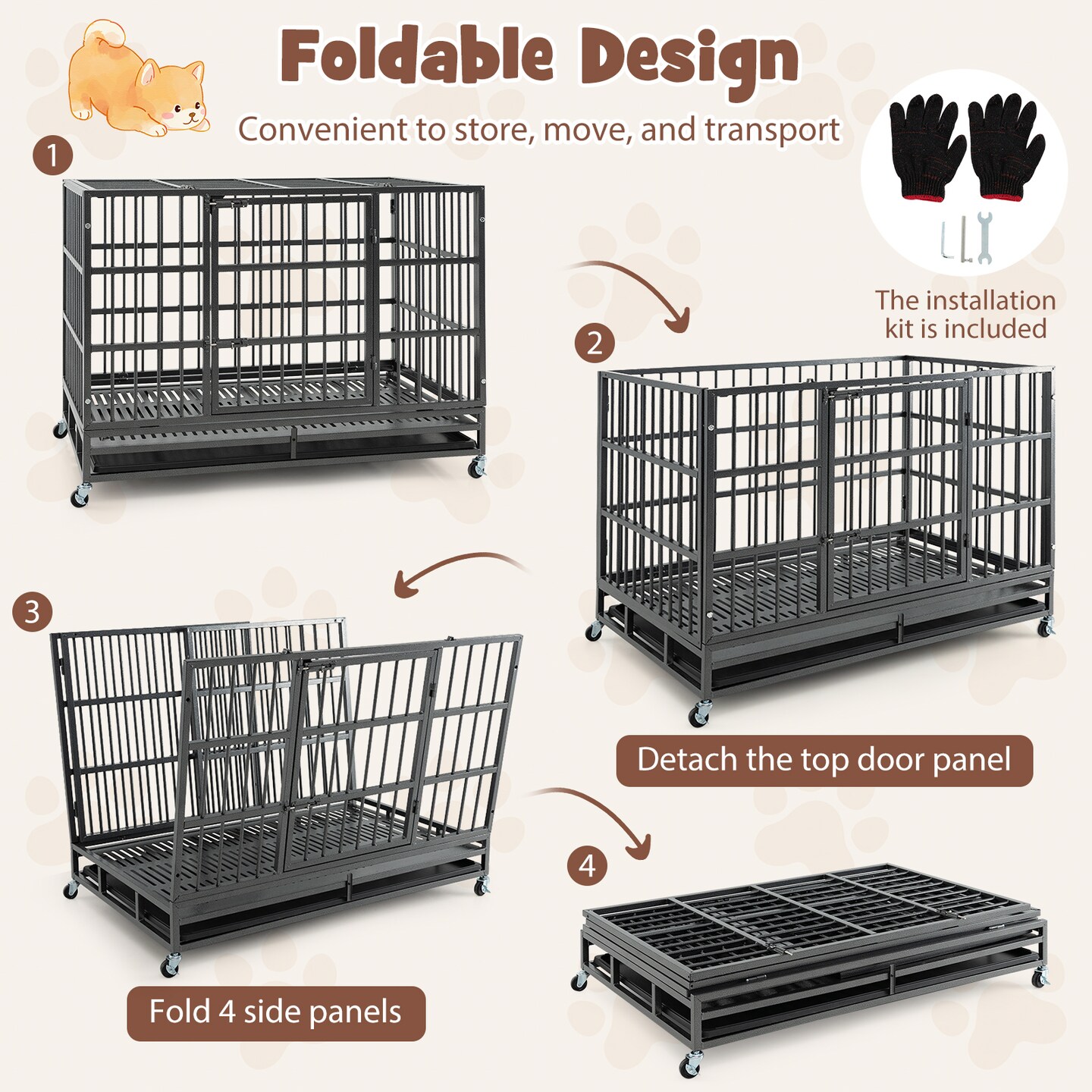 Black Metal Dog Crate Foldable Double Door Rolling Wheels Tray