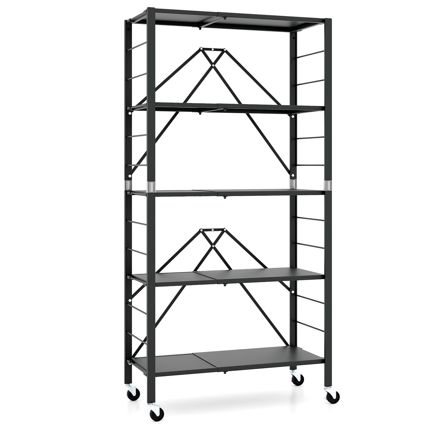 Black Metal Foldable Storage Shelf and Adjustable 5-Tier Shelves with Wheels