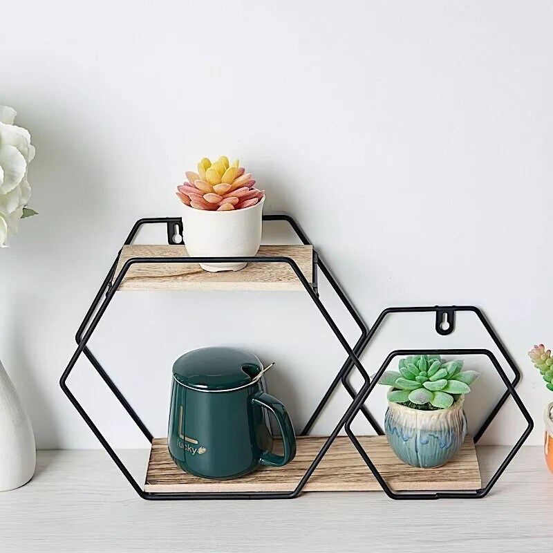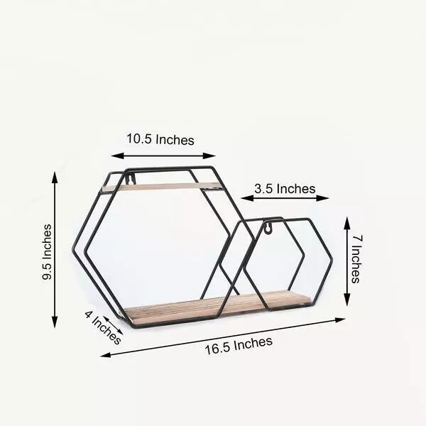 Black Natural 2 Tier Hexagon Metal Wood Geometric Floating Shelf Decorations