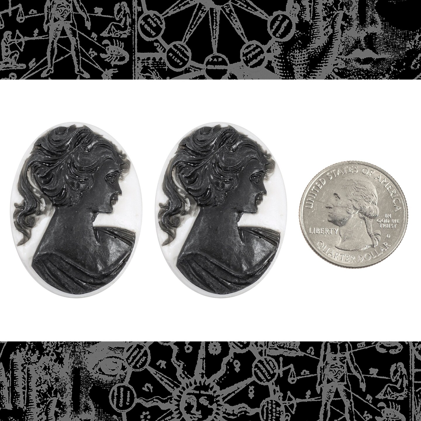 Black on White 40mm x 30mm Feminine Profile Resin Cameos - Set of Two - CAM240