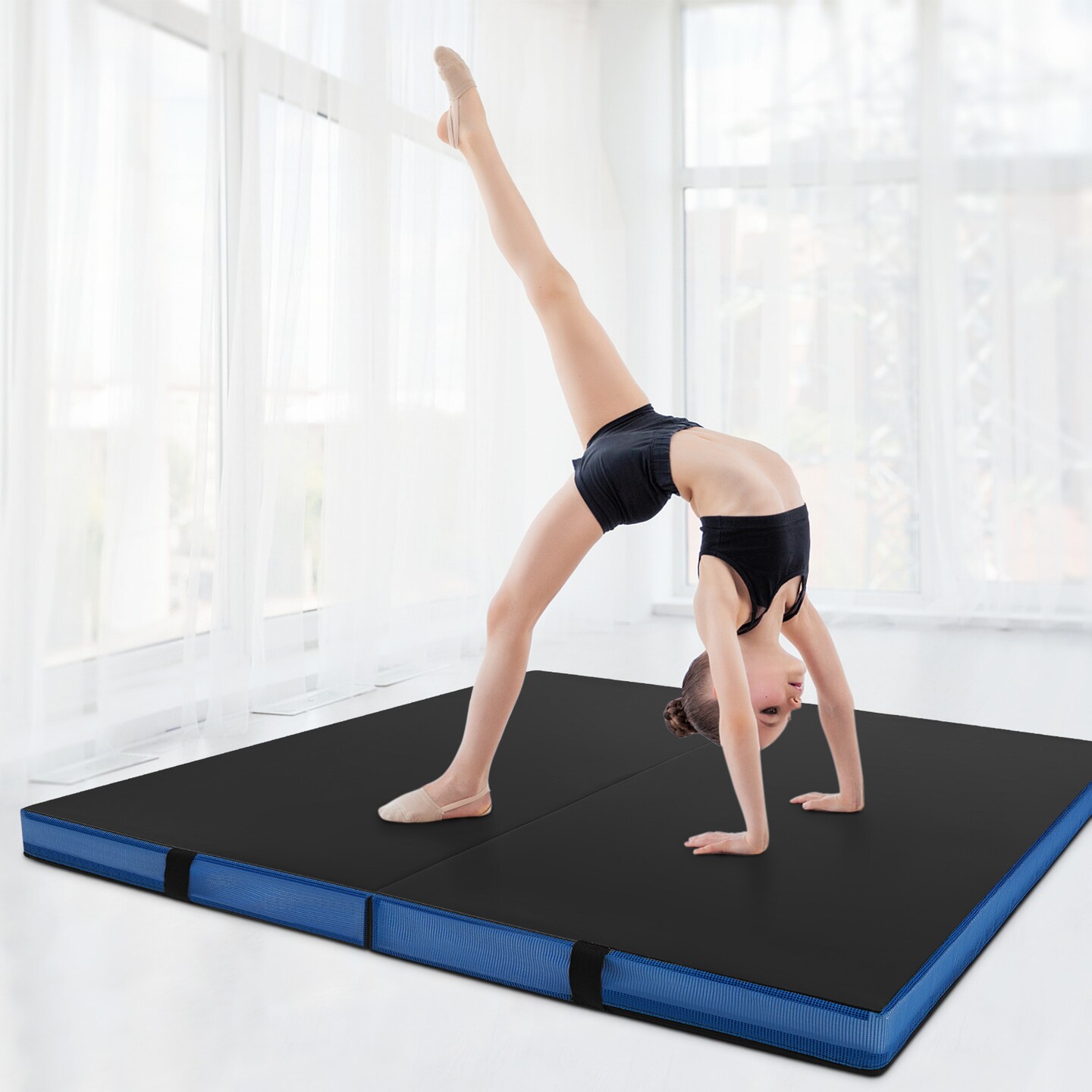 Black PU Leather Folding Gymnastics Mat with 4" Foam and Carry Handles
