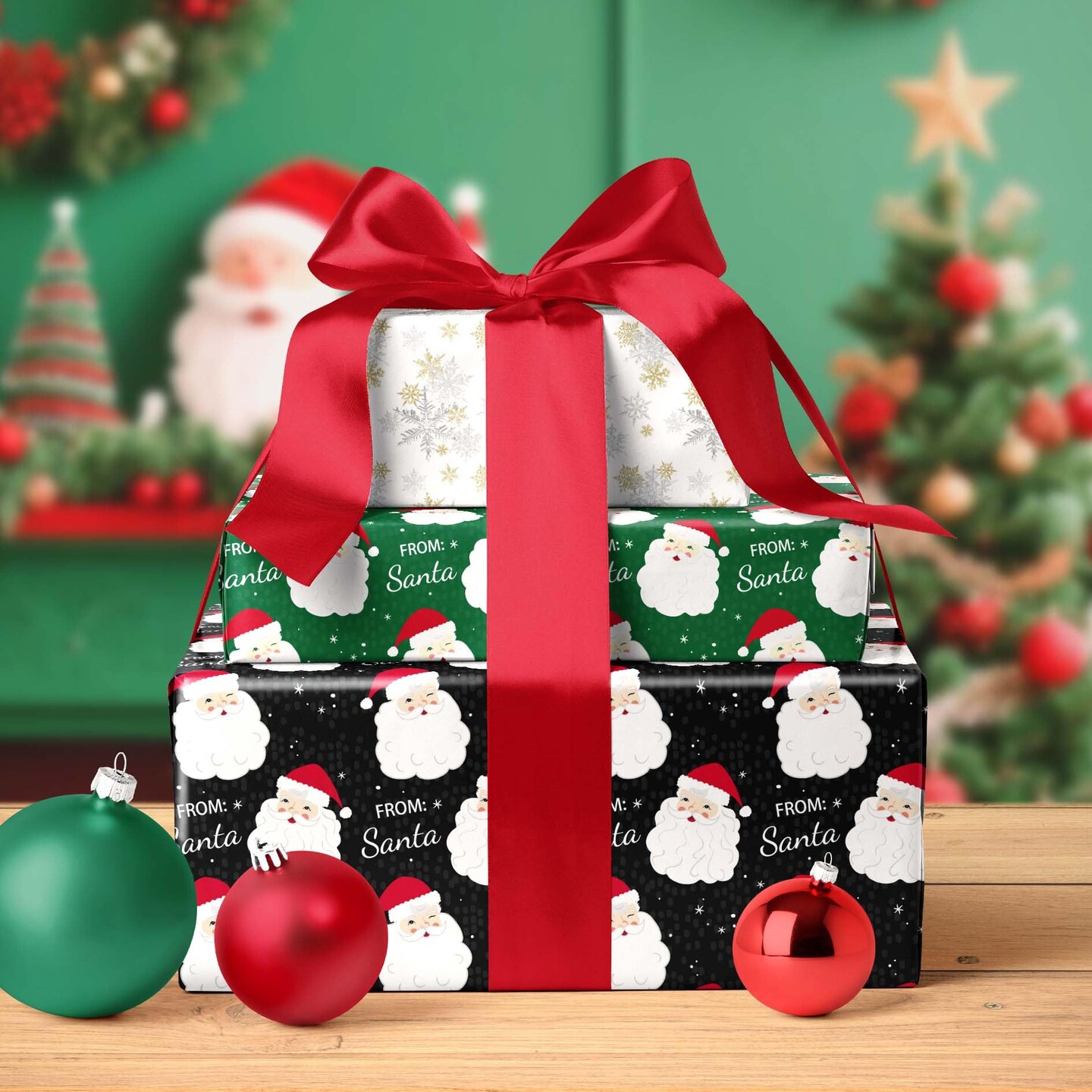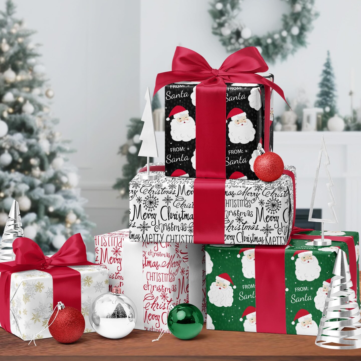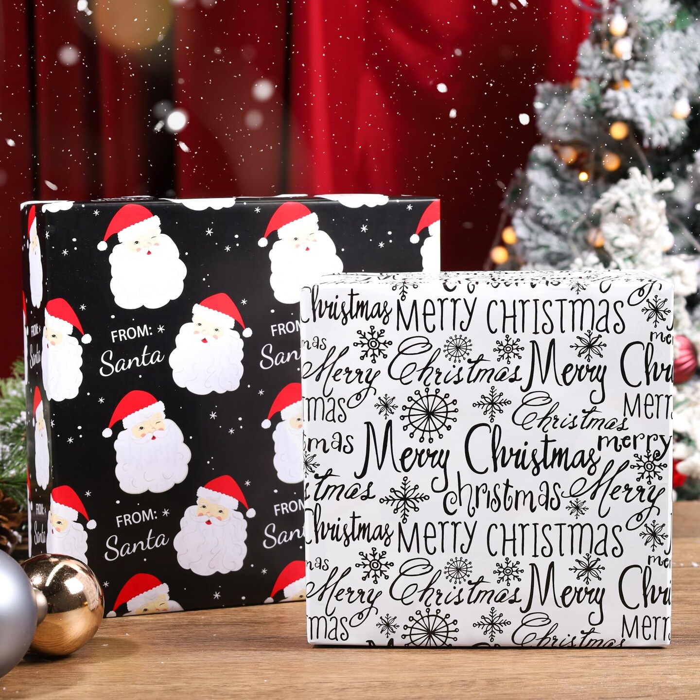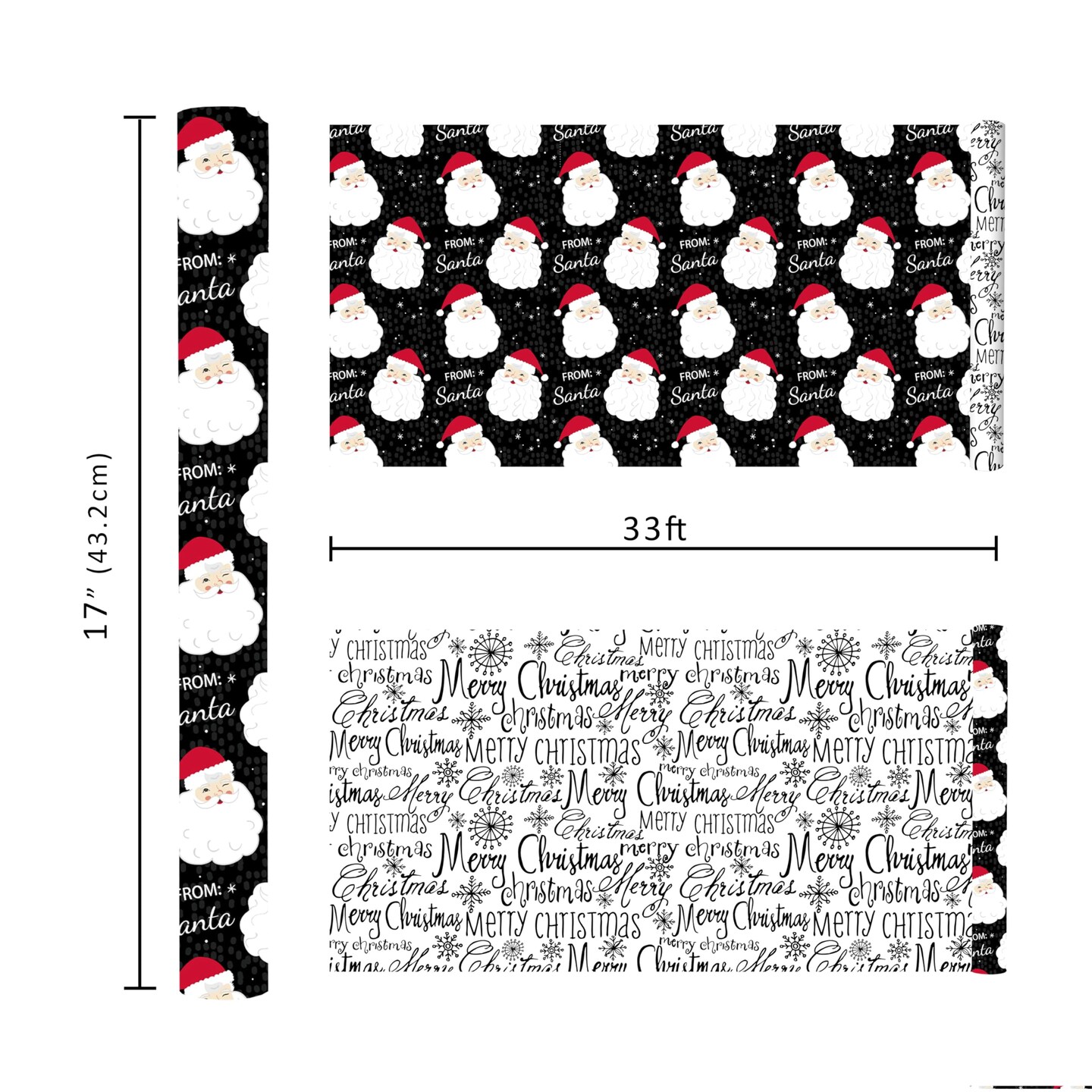 Black Santa Christmas Wrapping Paper, Reversible Holiday Gift Wrap with Classic From Santa & Merry Christmas Design for Kids, Season Party, Xmas Presents, 17 Inch X 33 Feet