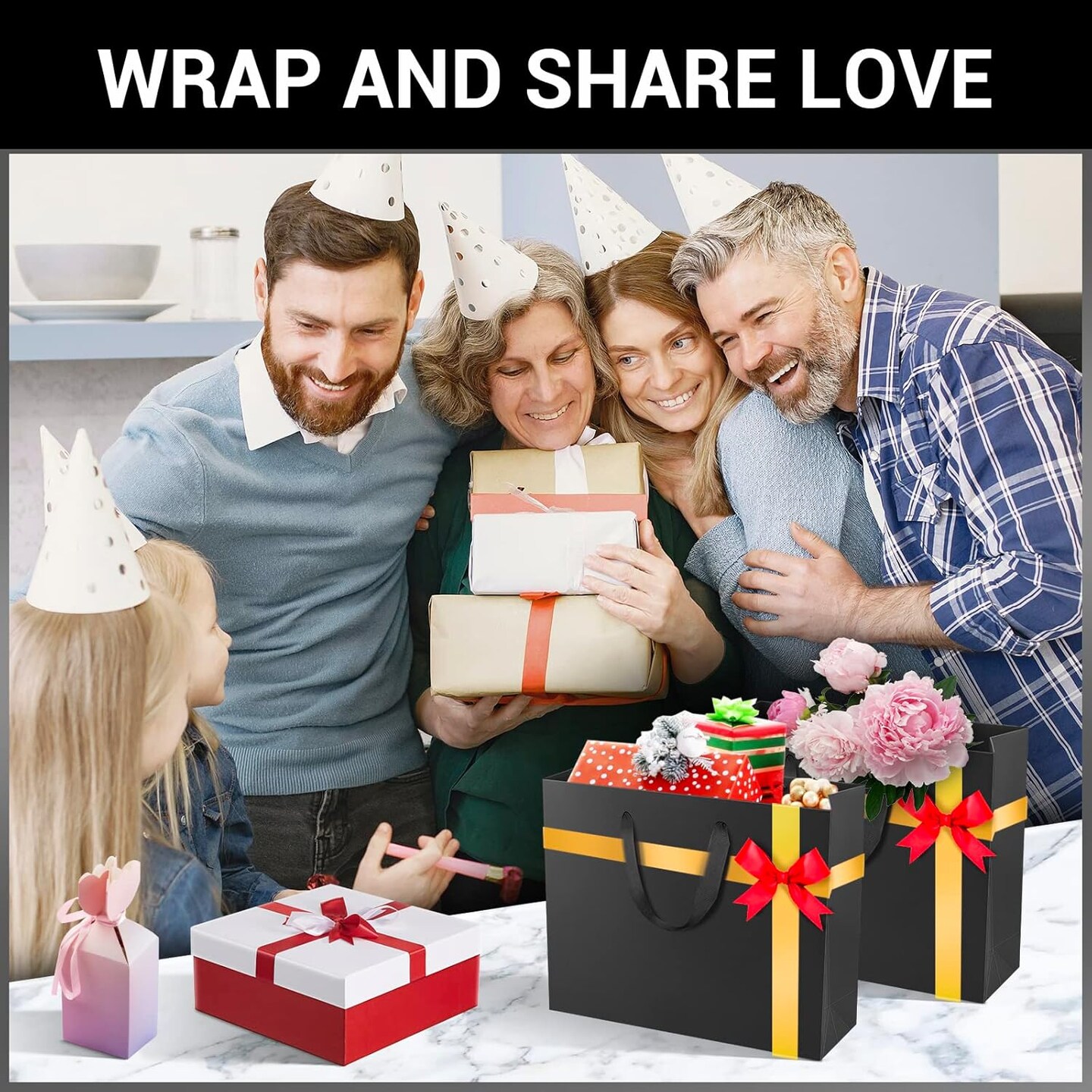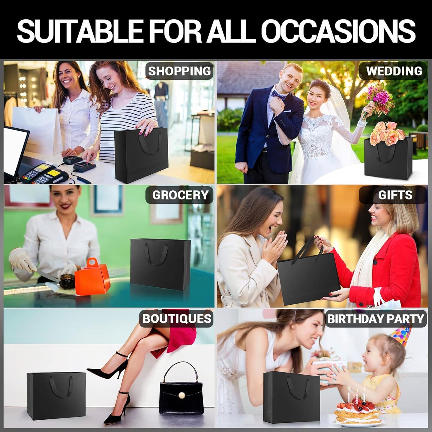 Black Shopping Gift Bags with Handles, 20 Pack 8.6" x3.9" x7" Mini Kraft Paper Gift Wrap Bags with Handles, for Business, Grocery, Boutique, Retail, Wedding, Party Favors, Birthdays