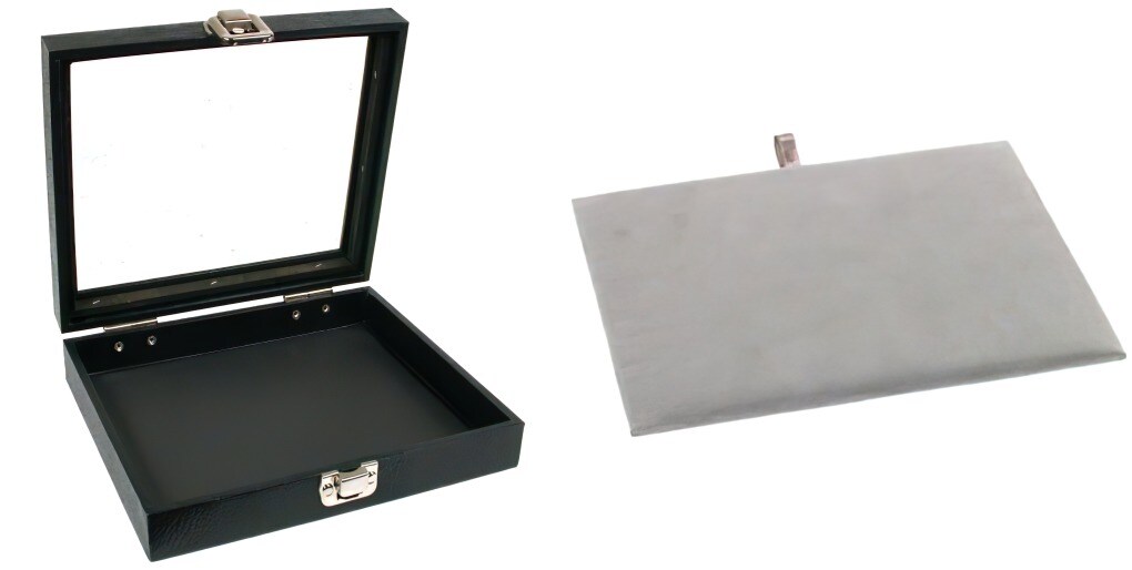 Black Sqaure Glass-top Case (Single Metal Latch) w/ Gray Leather Pad Insert