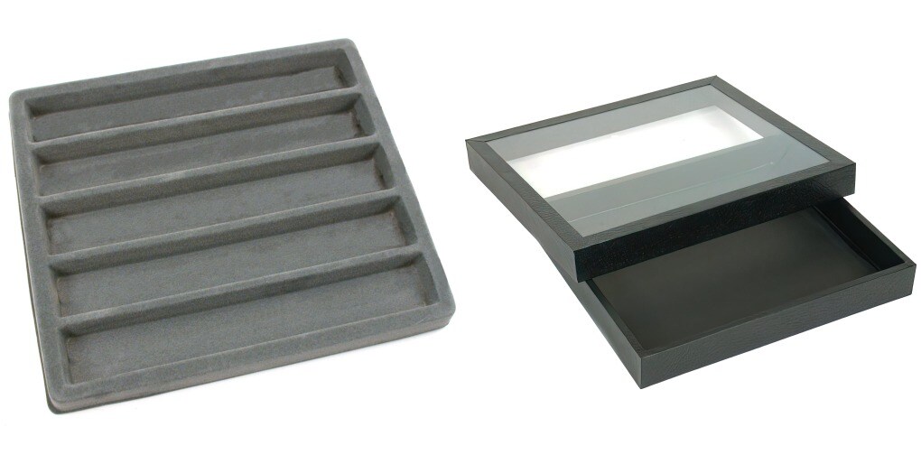 Black Square Display Case (Glass-top Removable Lid) w/ Gray 5-slot Plastic Tray