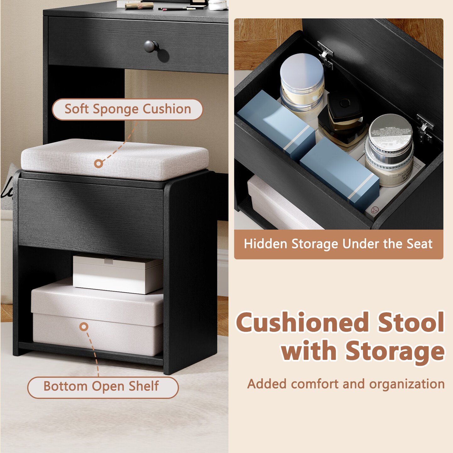 Black Vanity Table Set LED Mirror Makeup Desk With Stool Charging Ports