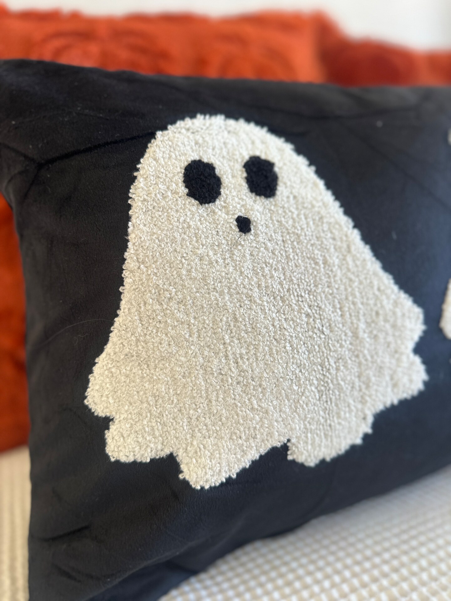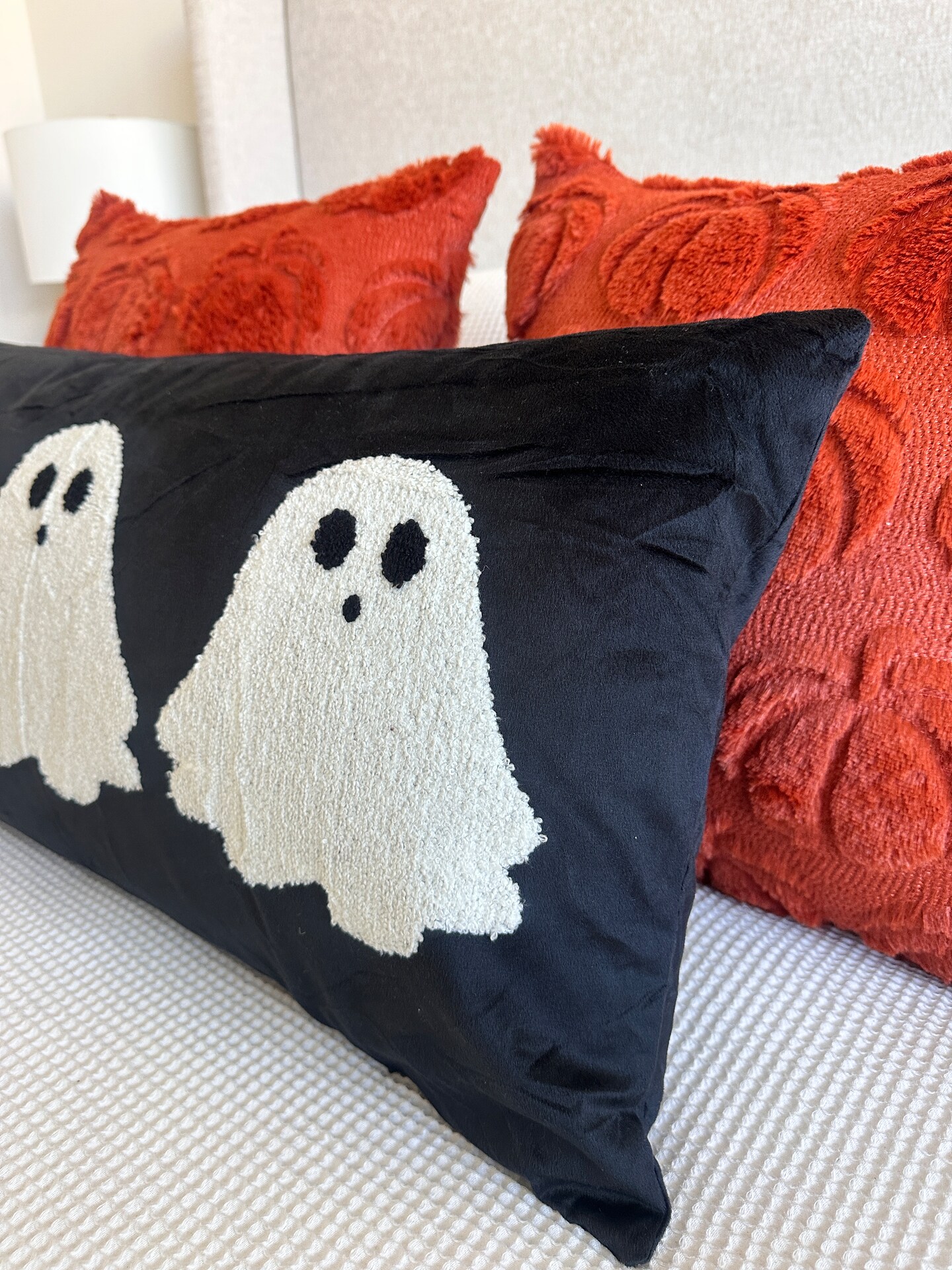 Black Velvet Ghost Lumbar Pillow Cover – 14x26” Embroidered White Ghost Design with Hidden Zipper