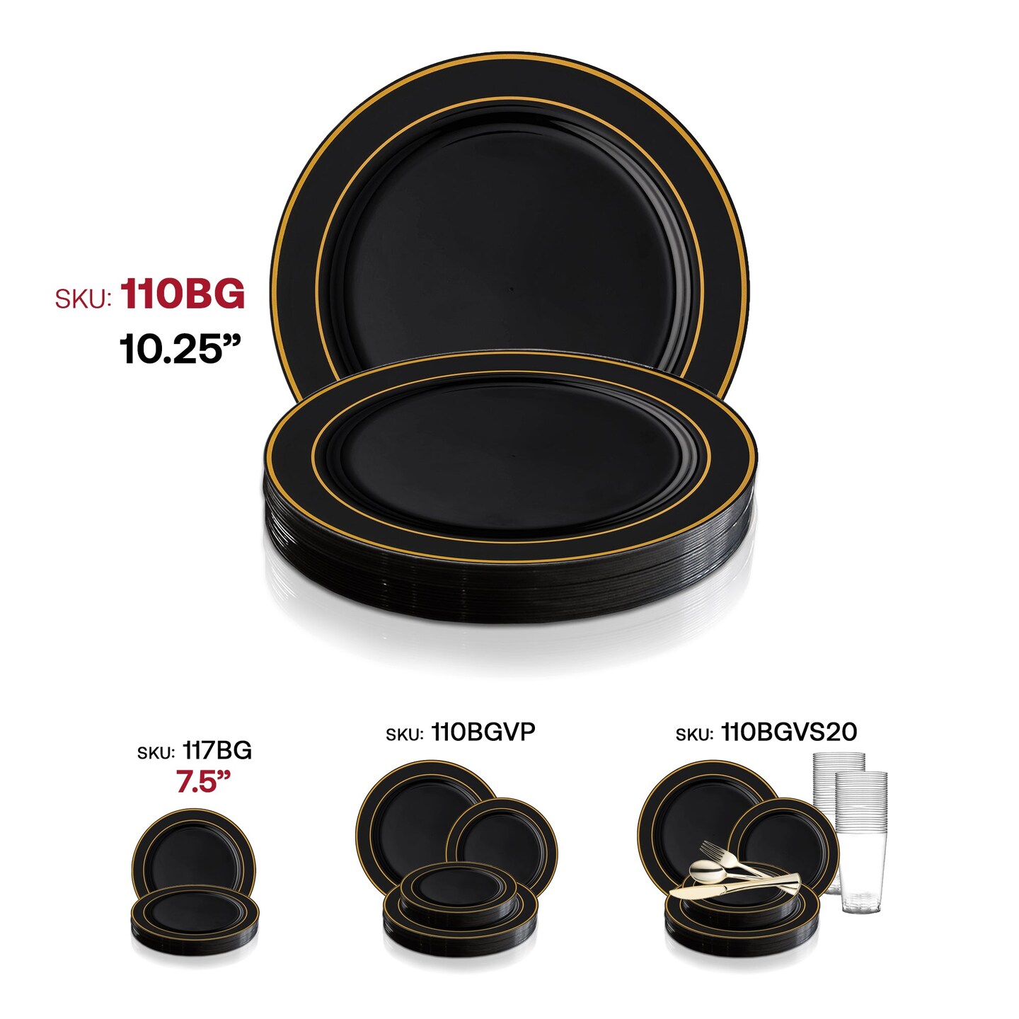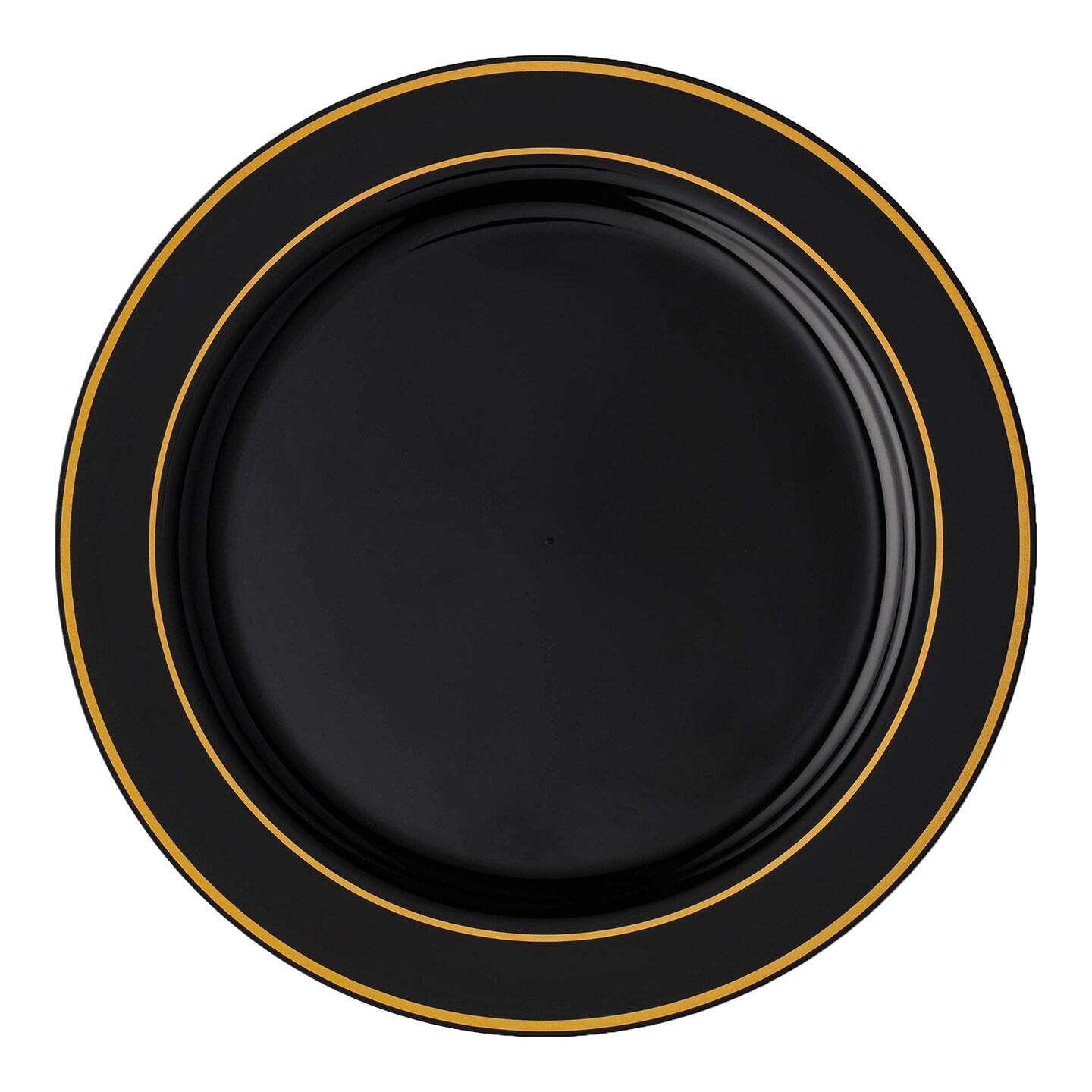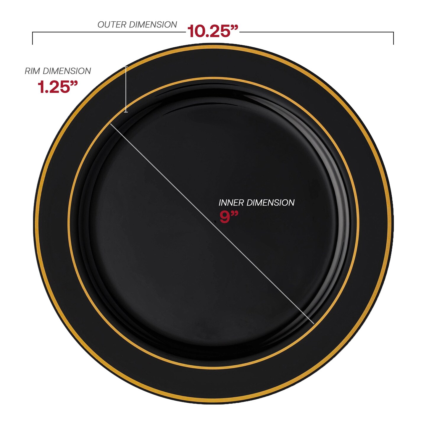 Black with Gold Edge Rim Plastic Dinner Plates - 10.25" (120 Plates)