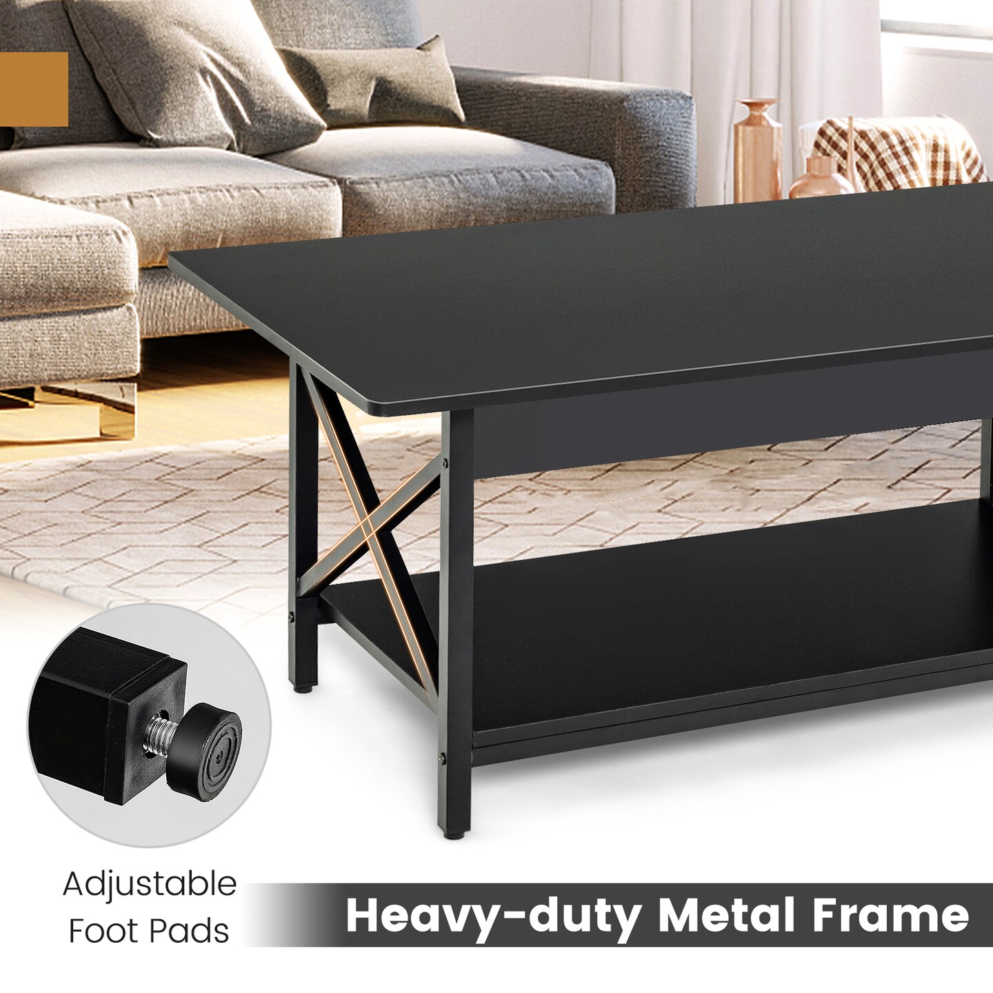 Black Wood Metal Coffee Table with Shelf, X Shaped Frame