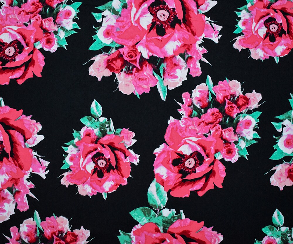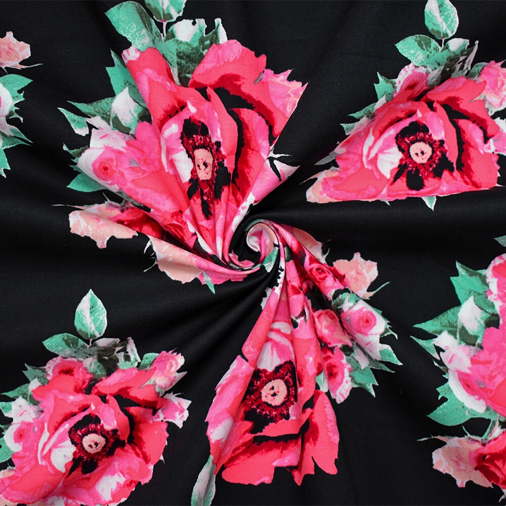 Black-Green-Pink Cotton Floral Print Stretch Spandex Poplin Woven Fabric By the Yard