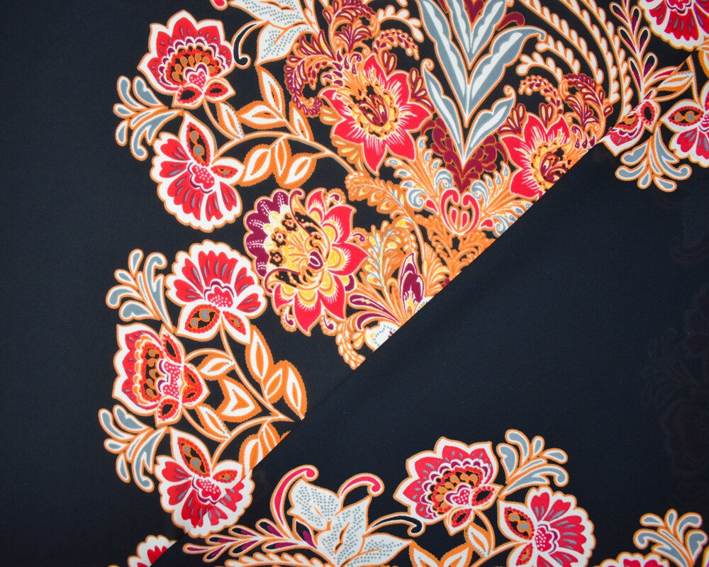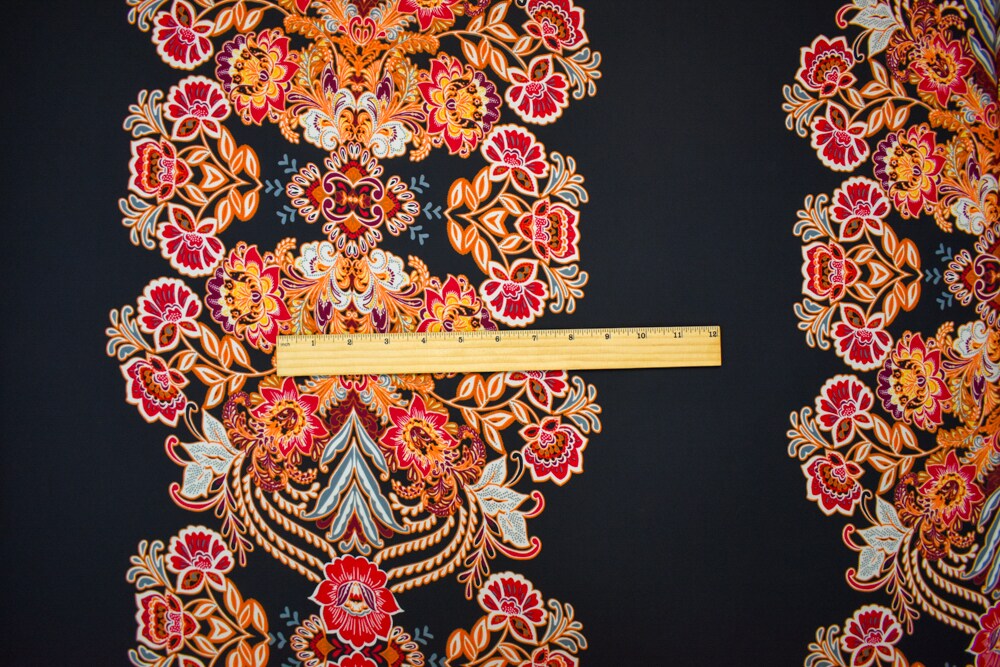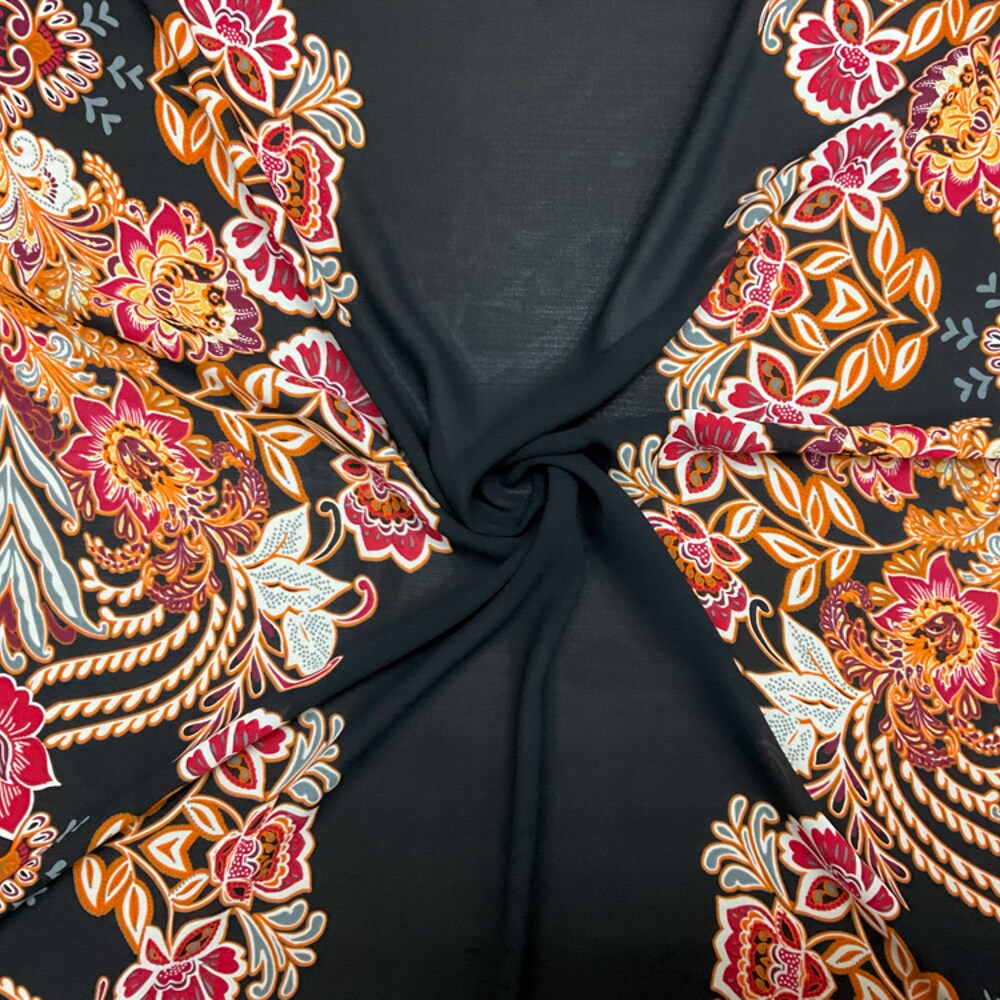 Black-Orange-Multi Poly Floral Stripe Printed Chiffon Woven Fabric By the Yard