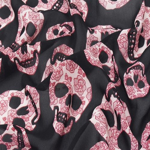 Black/Red/Multi Floral Skull Printed Chiffon Woven Fabric By the Yard