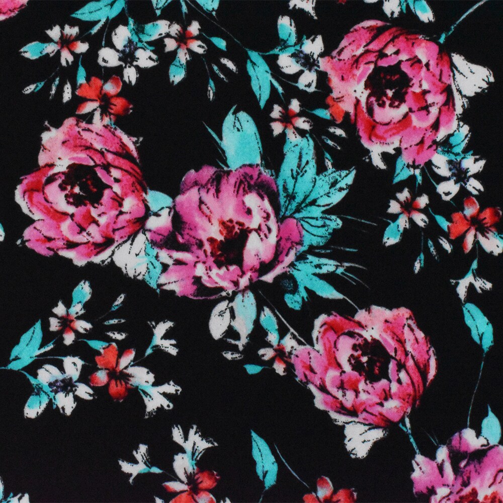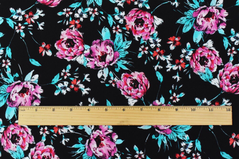 Black-Teal-Pink Polyester Floral Printed Momie Crepe Georgette Woven Fabric By the Yard