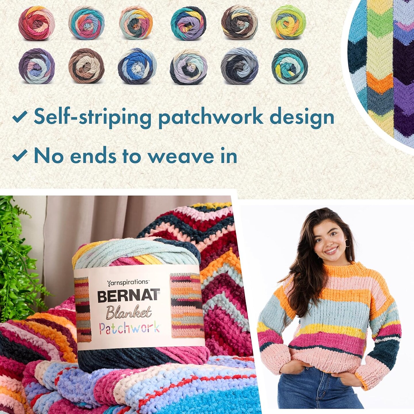Blanket Patchwork 90s Vibe Yarn – 2 Pack Super Bulky #6, 300g / 10.5oz Each, 220 Yards, 100% Polyester for Knitting, Crochet & DIY Projects