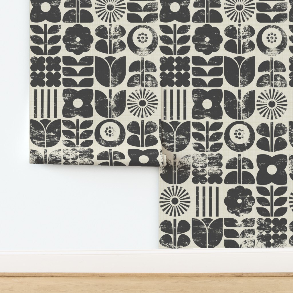 Block Print Floral Black Cream Botanical Retro Scandinavian Monochromatic Mcm Custom Removable Wallpaper by Spoonflower Peel & Stick Wallpaper 2FT Wide