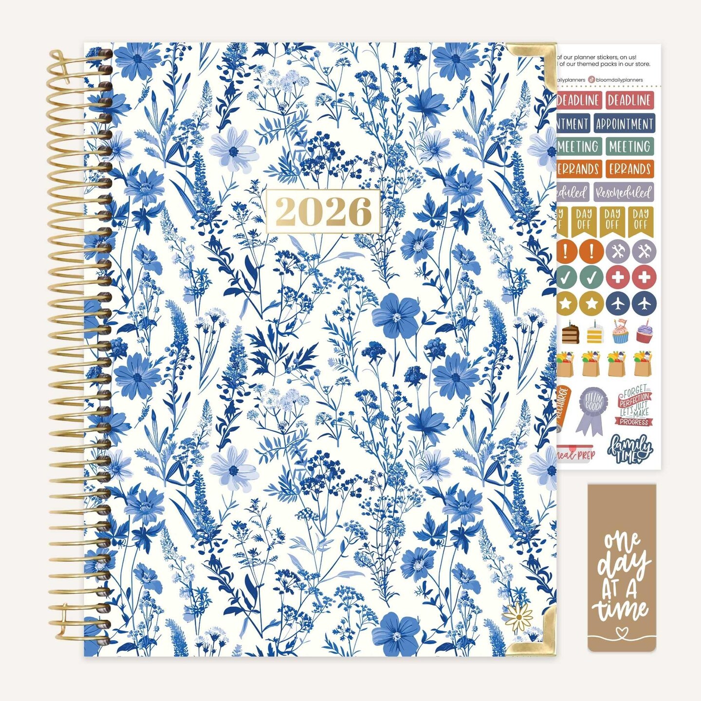 bloom daily planners 2026 Hard Cover Weekly & Monthly Planner, 8.5" x 11", Blue & White Floral