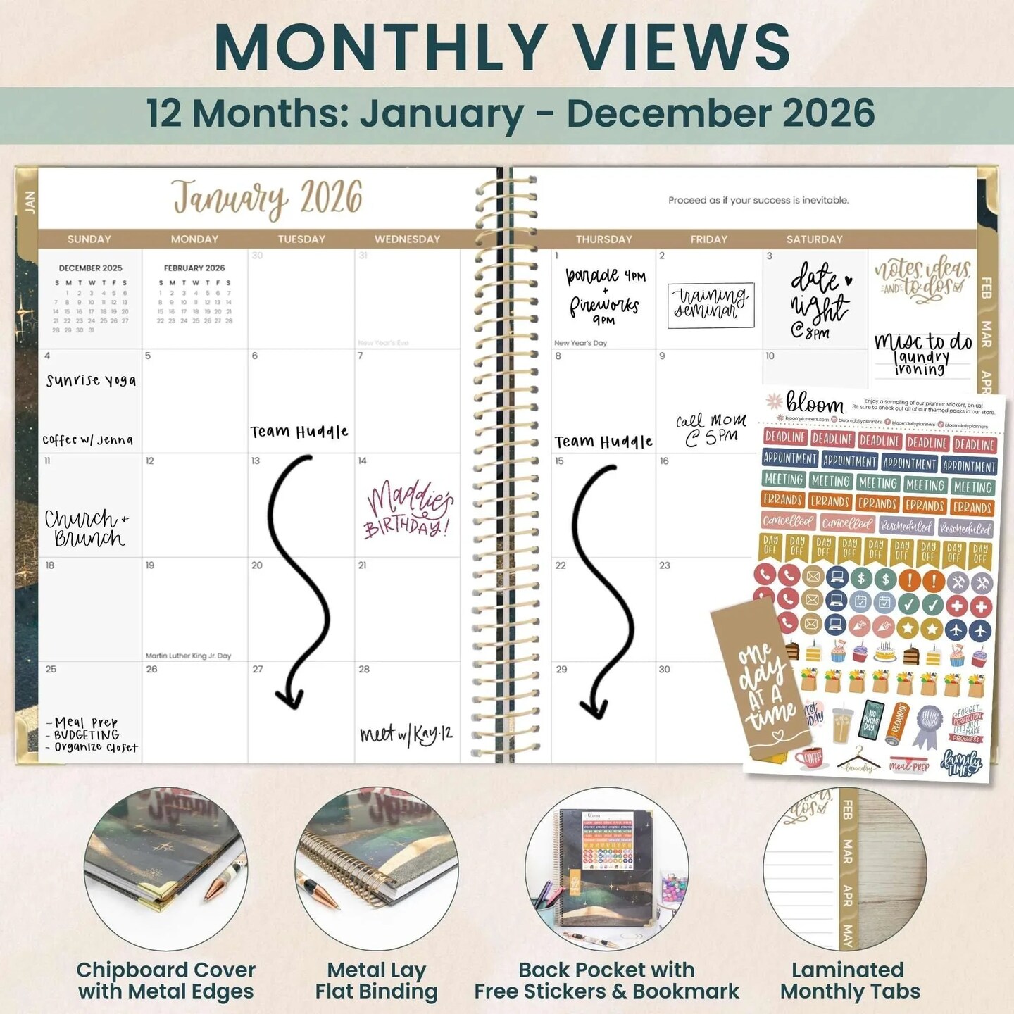 bloom daily planners 2026 Hard Cover Weekly & Monthly Planner, 8.5" x 11", Celestial Skies