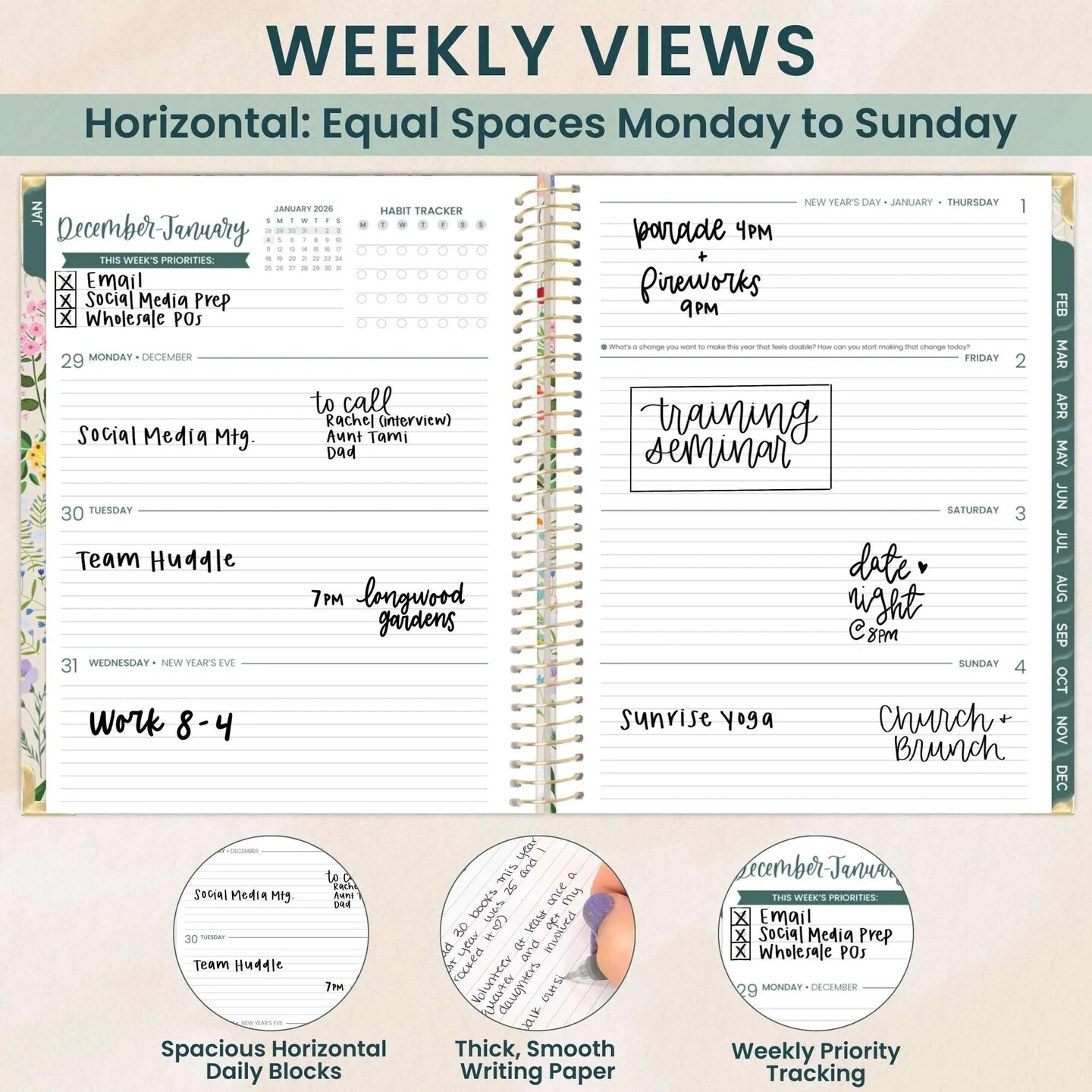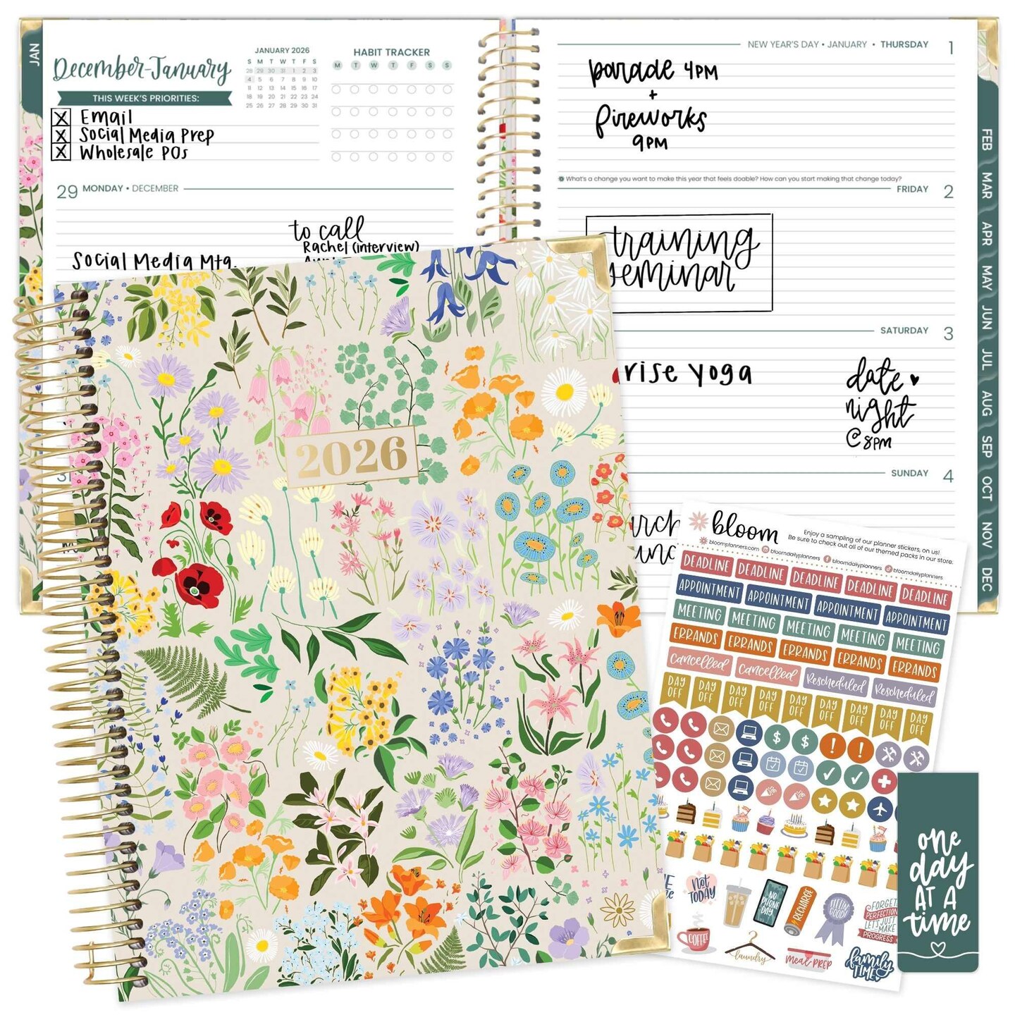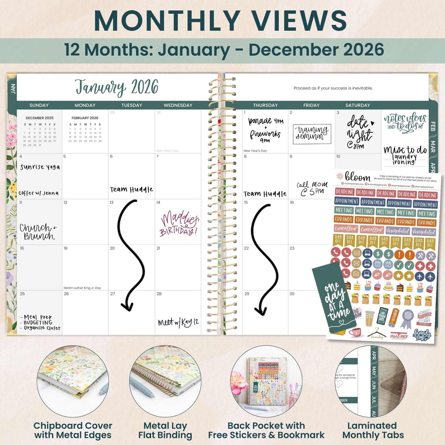 bloom daily planners 2026 Hard Cover Weekly & Monthly Planner, 8.5" x 11", Garden Party, Beige