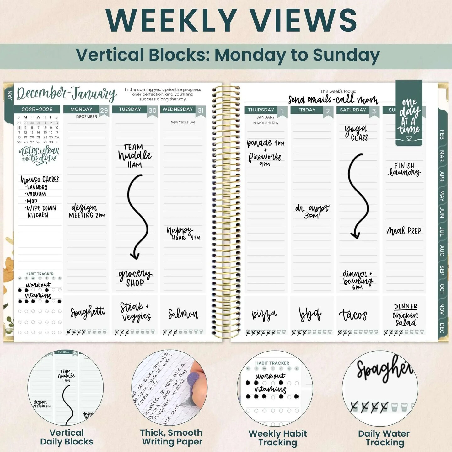 bloom daily planners 2026 Hard Cover Weekly & Monthly Vision Planner, 7.5" x 9", Beige Bouquet