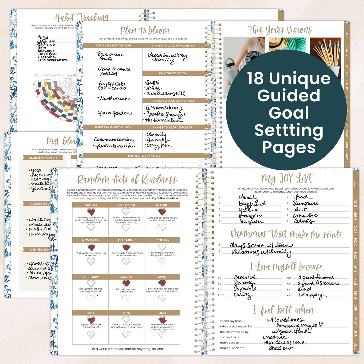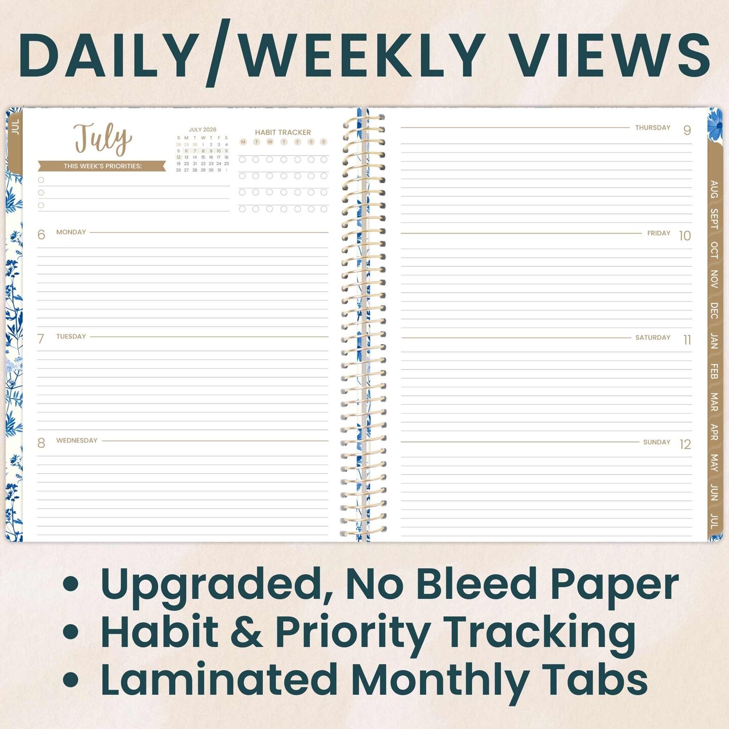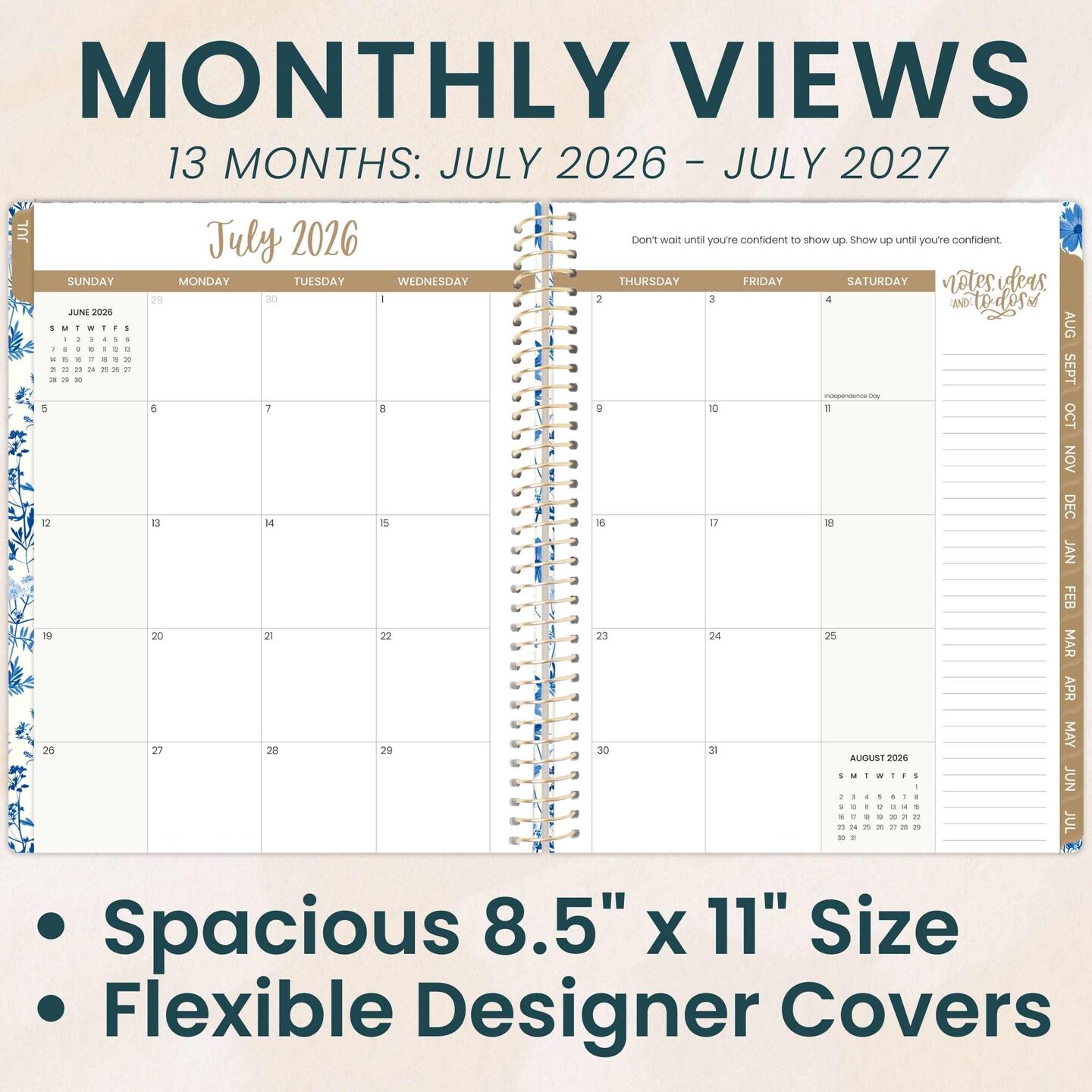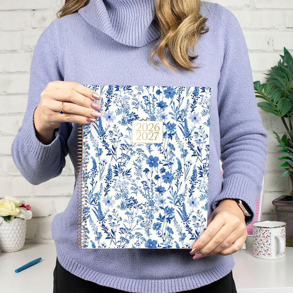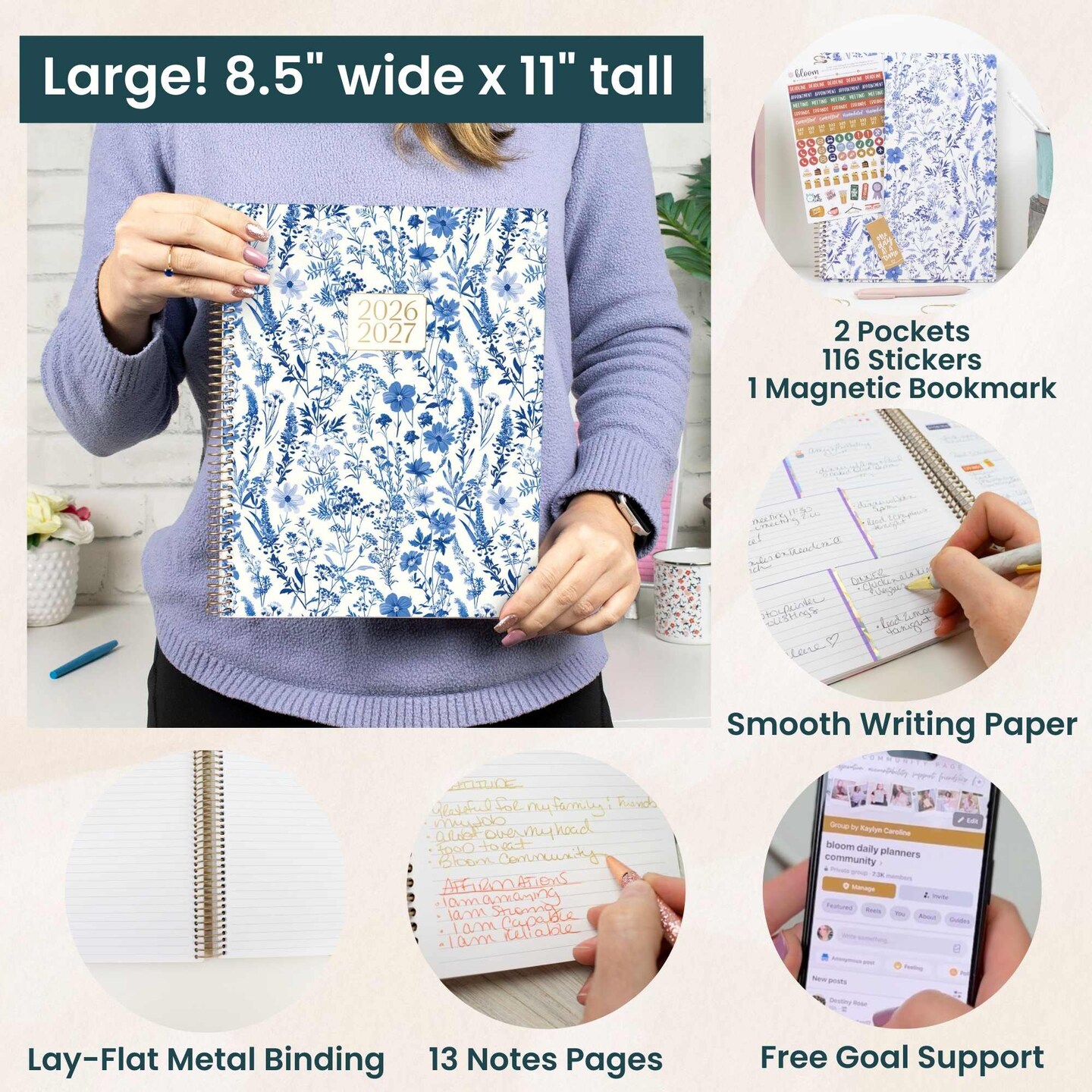 bloom daily planners 2026-2027 Academic Planner, 13 Month Soft Cover Monthly & Weekly, 8.5" x 11", Stickers Included, Blue & White Floral