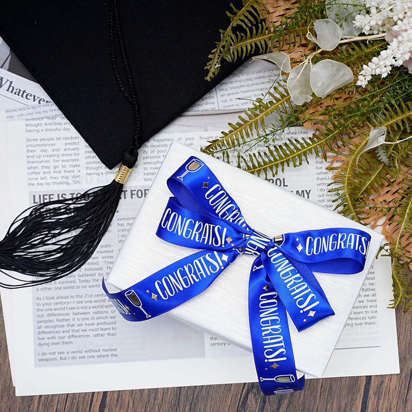 Blue and White Gold Congrats Grad Satin Ribbon - 3 Rolls 1 Inch x 15 Yards