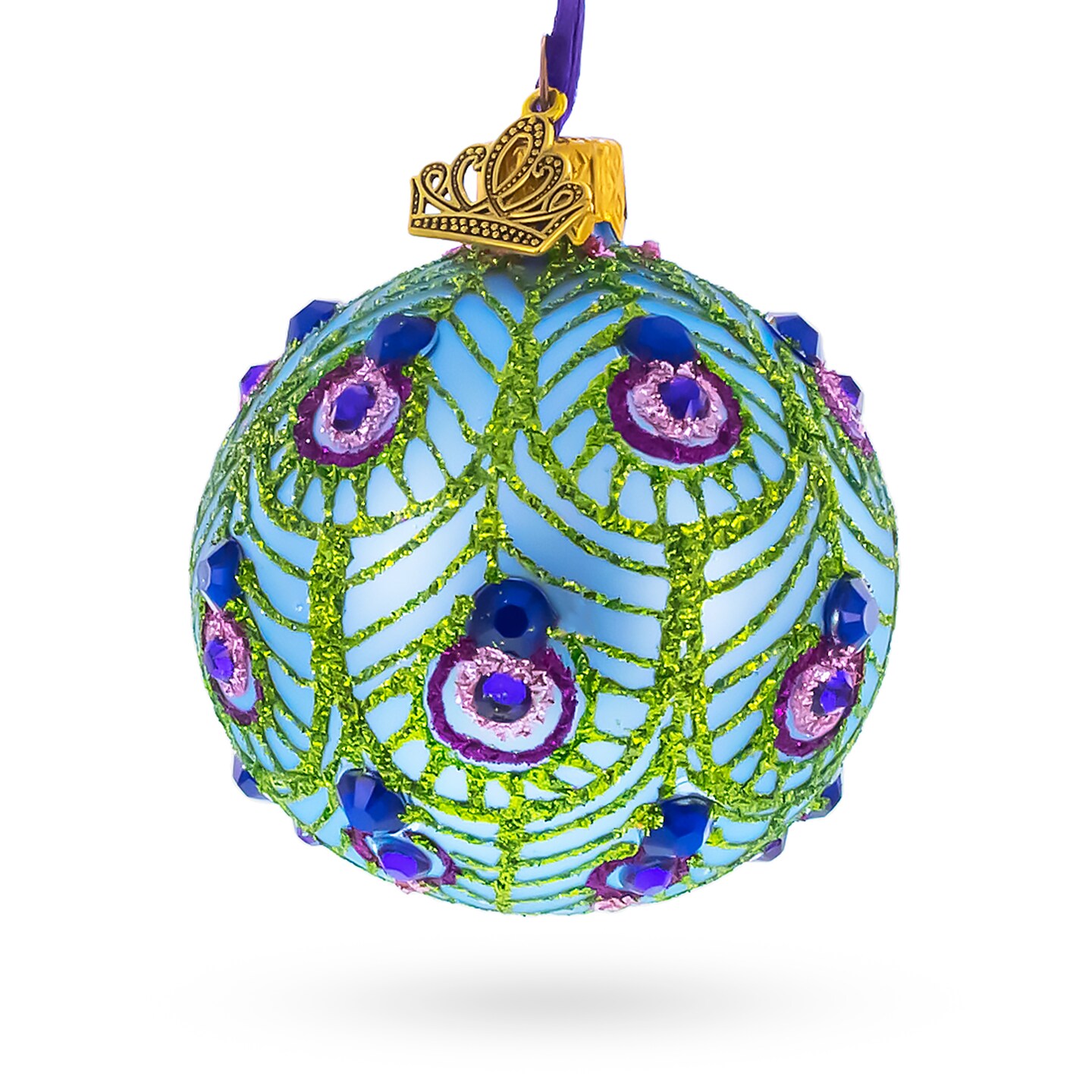 Blue Ball with Glittered Peacock Feather Design Glass Ball Christmas Ornament
