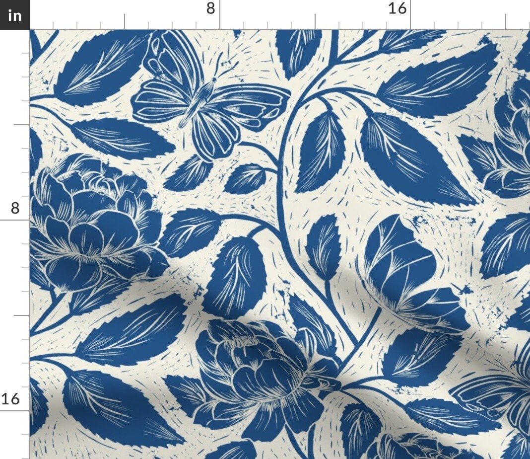 Blue Block Print Butterflies Flowers Traditional Botanical Toile Peonies Cottagecore Custom Printed Fabric by Spoonflower Various Fabrics by the Yard or Fat Quarter